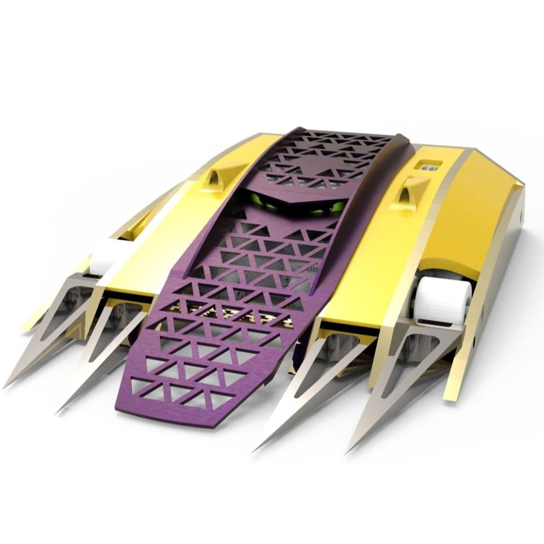 Команда «Неоновые Тигры» привезёт на чемпионат полосатого мини-робота «Зубастик». Габариты машины — 22,5×24×5,1 см, масса — 1,5 кг.