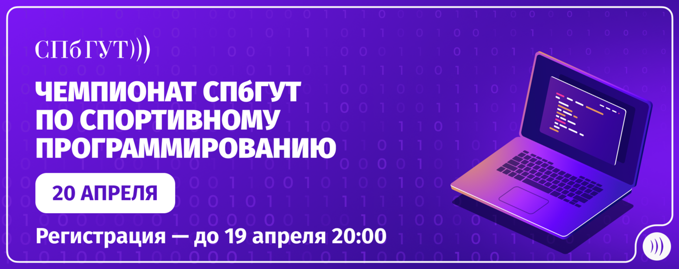 20 апреля Санкт-Петербургский университет телекоммуникаций в дистанционном формате проведёт чемпионат по спортивному программированию. Приглашаются студенты 1—3 курсов бакалавриата и специалитета.