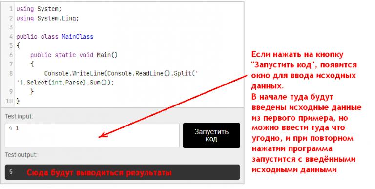 Под окном с редактором кода находятся две кнопки: «Отправить» (слева) и «Запустить код» (справа). После попытки решения рекомендуется сначала нажимать на кнопку «Отправить», по которой код можно проверить, вводя различные входные данные в появившемся текстовом окне.