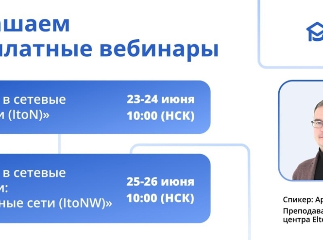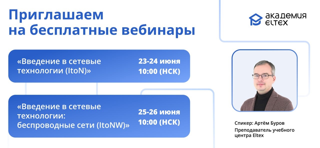 Факультет кибербезопасности и Академия Eltex приглашает студентов на бесплатные вебинары по сетевым технологиям с 23 по 26 июня.