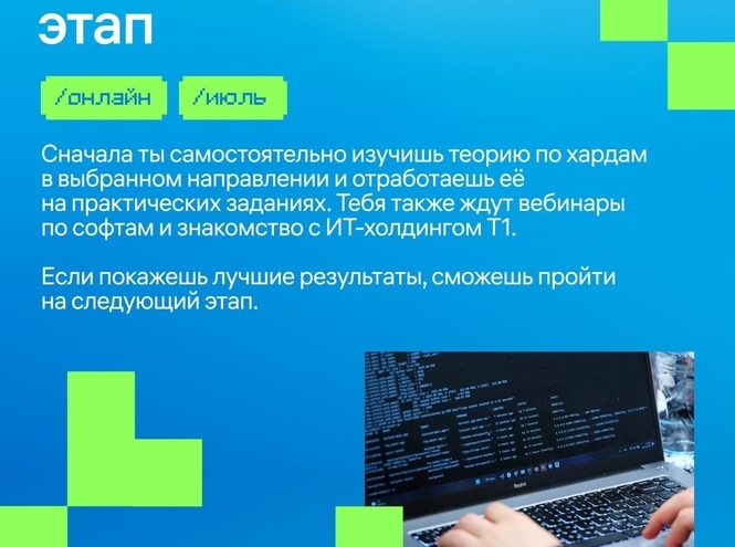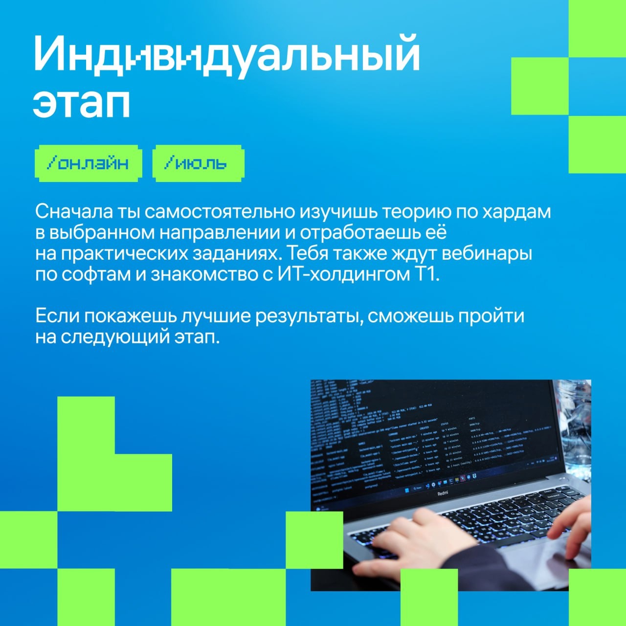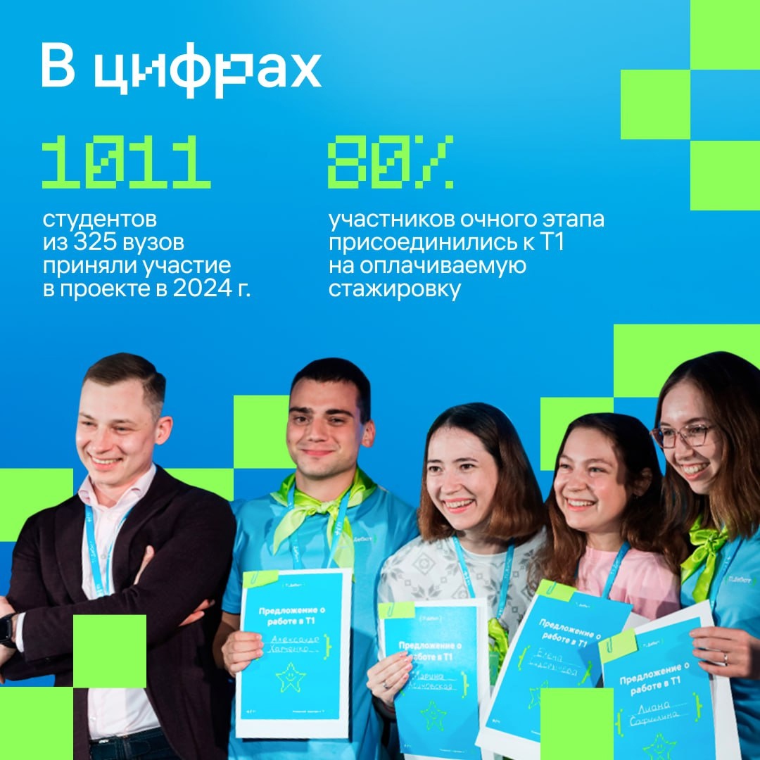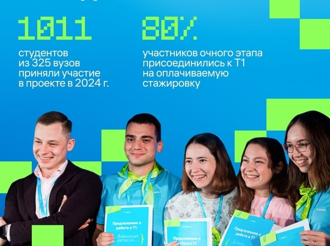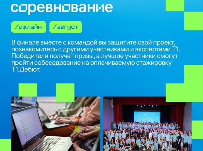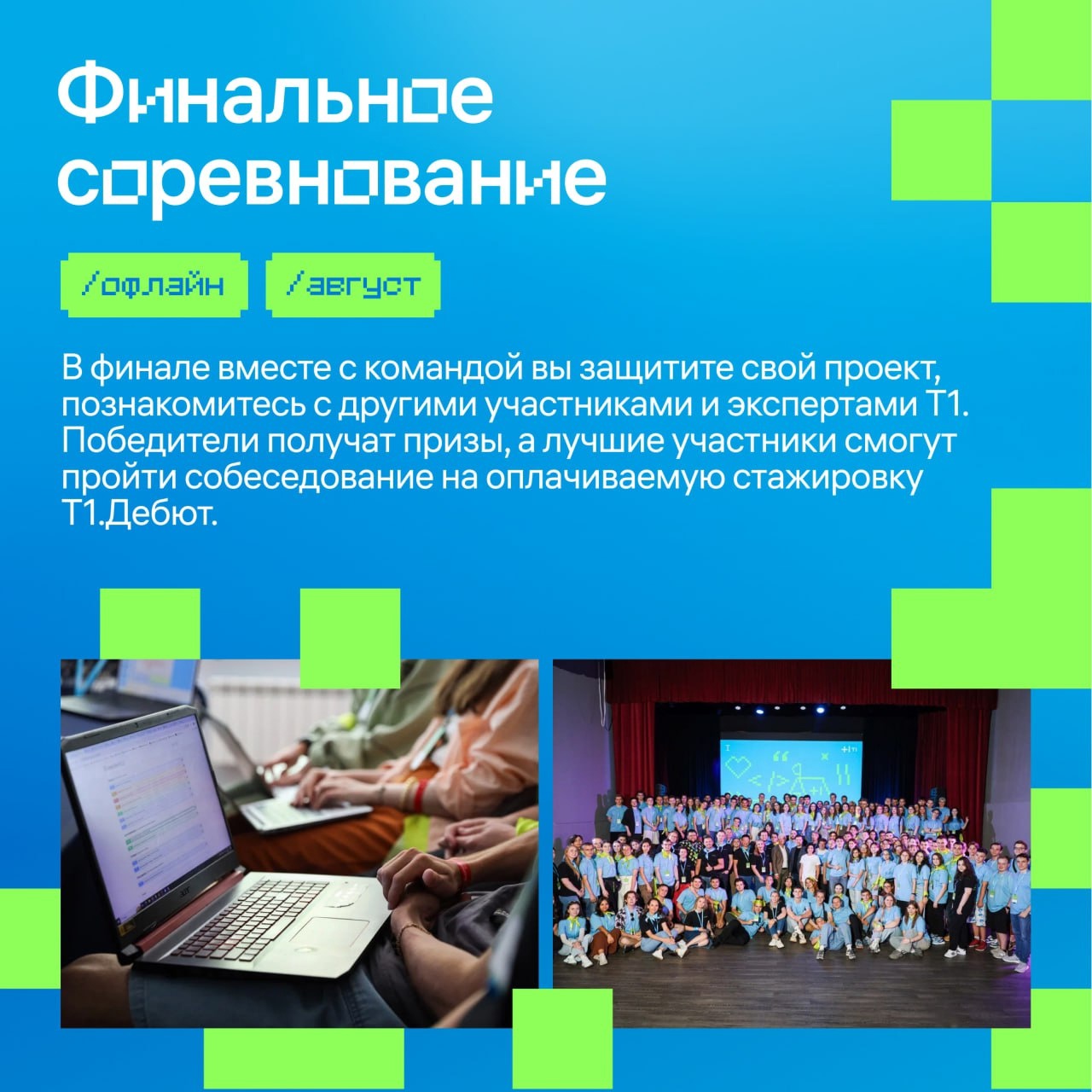 Финалисты получат сертификат участника и возможность пройти собеседование в Т1 на оплачиваемую стажировку в удаленном или гибридном формате.