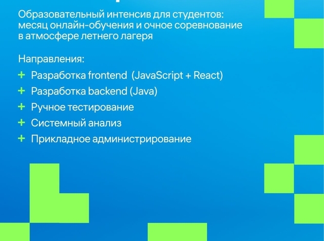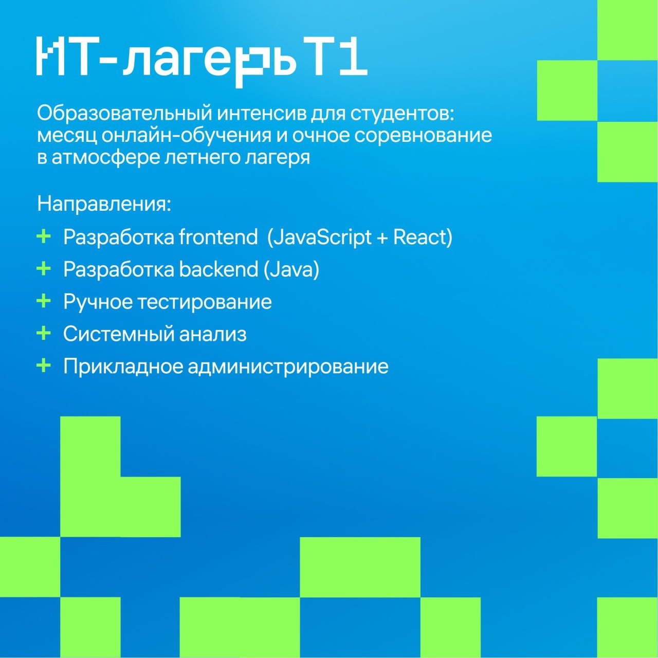ИТ-холдинг Т1 приглашает студентов технических и ИТ-специальностей в ИТ-лагерь Т1 — бесплатный интенсив по погружению в профессию: системный анализ, разработка, тестирование, прикладное администрирование (старт в DevOps). Можно участвовать даже без опыта!