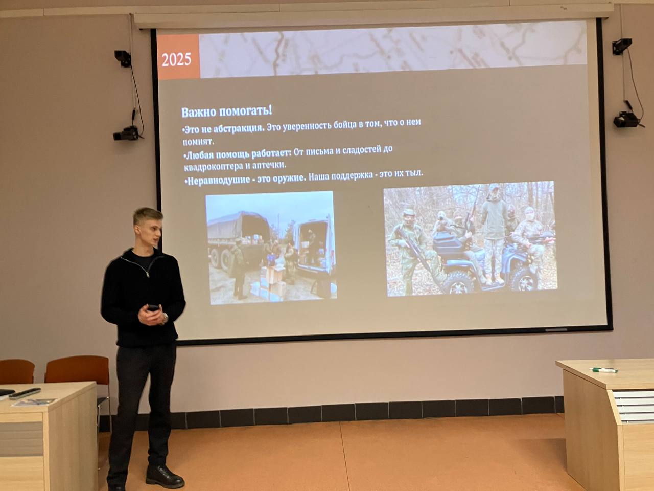 Михаил поделился впечатлениями о поездке в Луганскую и Донецкую область, рассказал студентам о встречах с бойцами. Он отметил, что мирные жители и военнослужащие «ждут доброго слова, весточки от родных и близких» и напоминают о ценности жизни «здесь» и присутствии комфорта, которого мы обычно не замечаем.