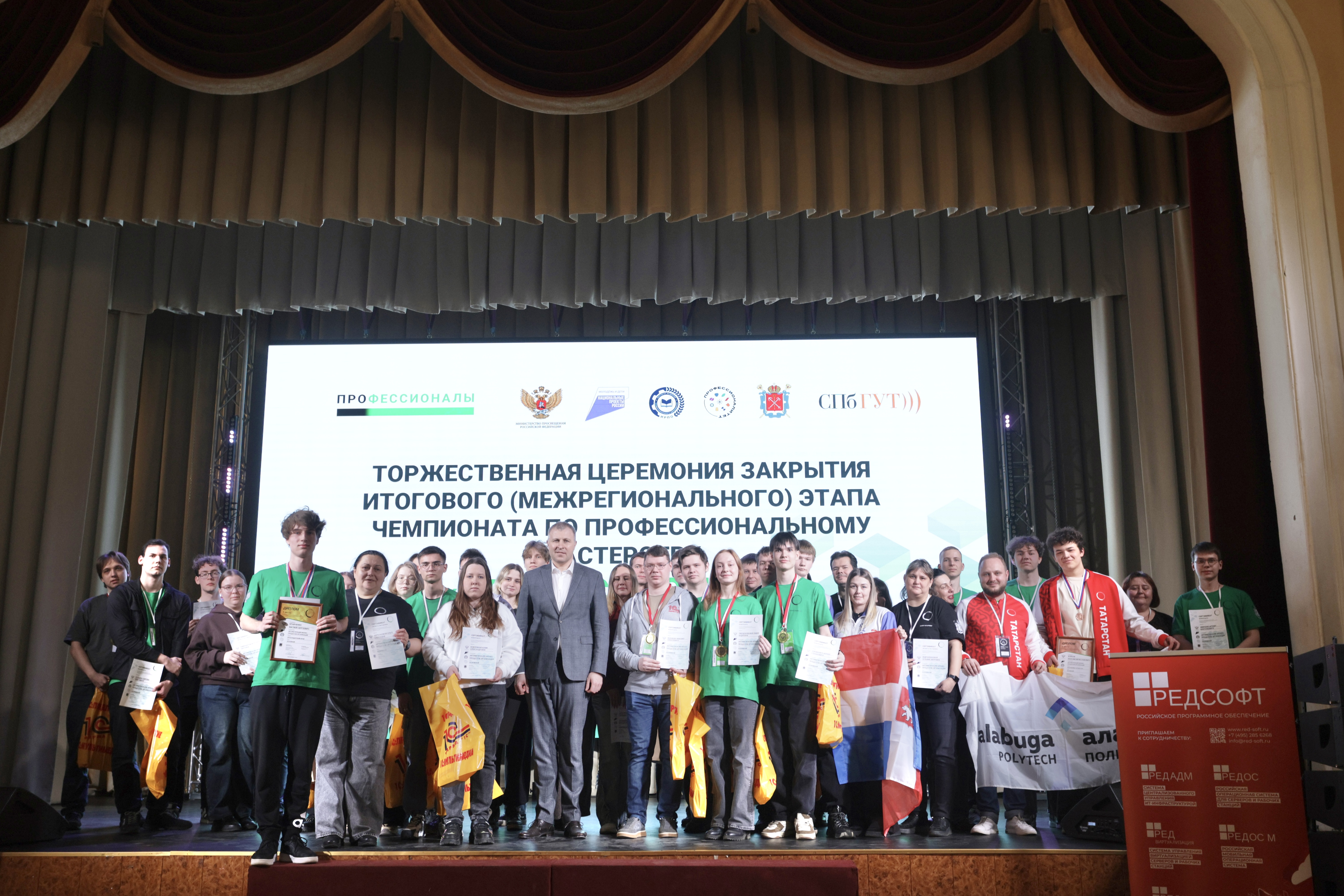 В Санкт-Петербурге на площадке СПбГУТ прошла торжественная церемония награждения победителей итогового (межрегионального) этапа Всероссийского чемпионатного движения «Профессионалы». В соревнованиях по четырем ИТ-компетенциям встретились победители региональных этапов из десятков субъектов РФ – от Санкт-Петербурга до Сахалина, от Краснодара до Архангельска.