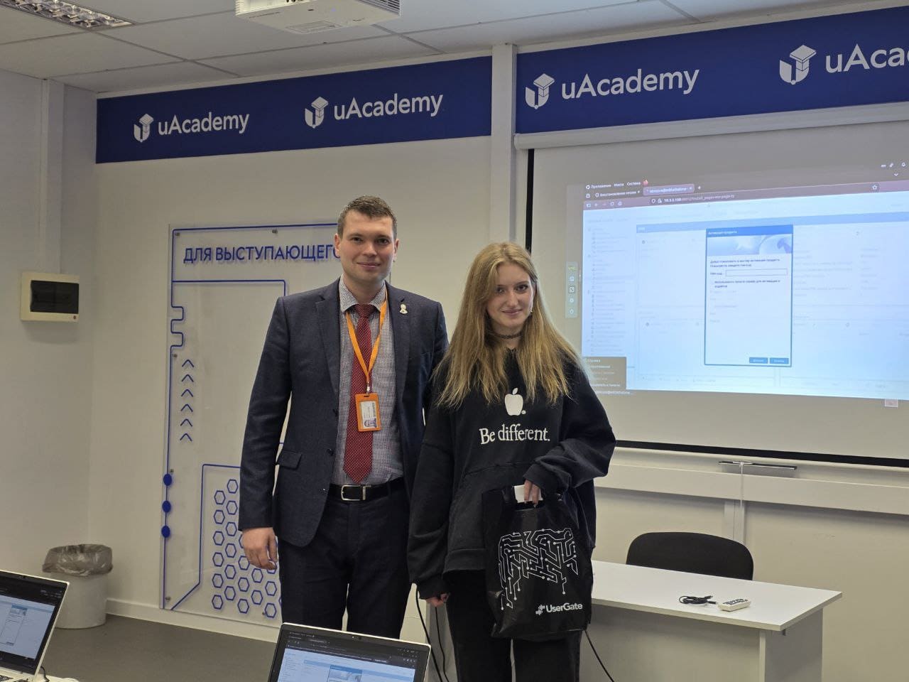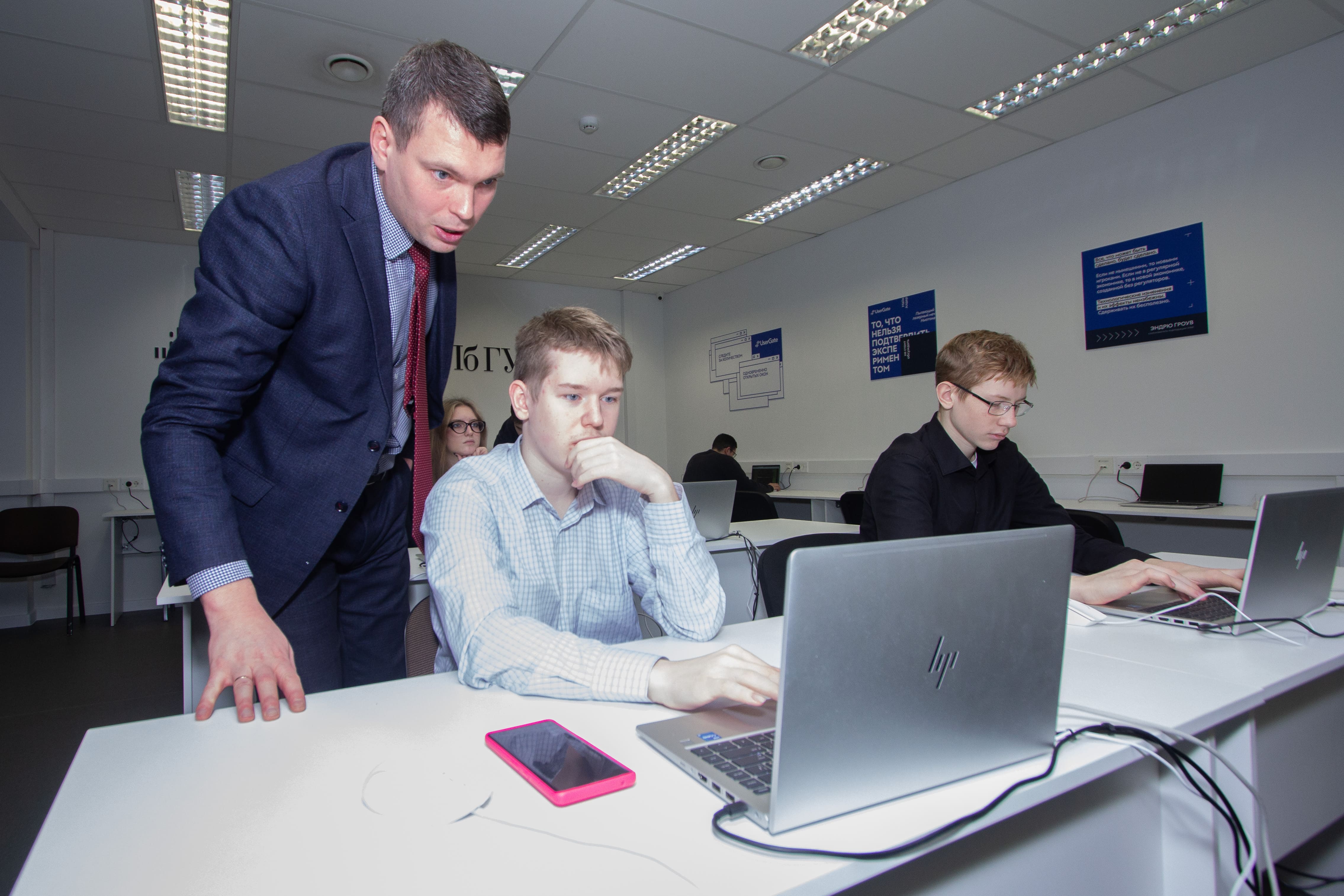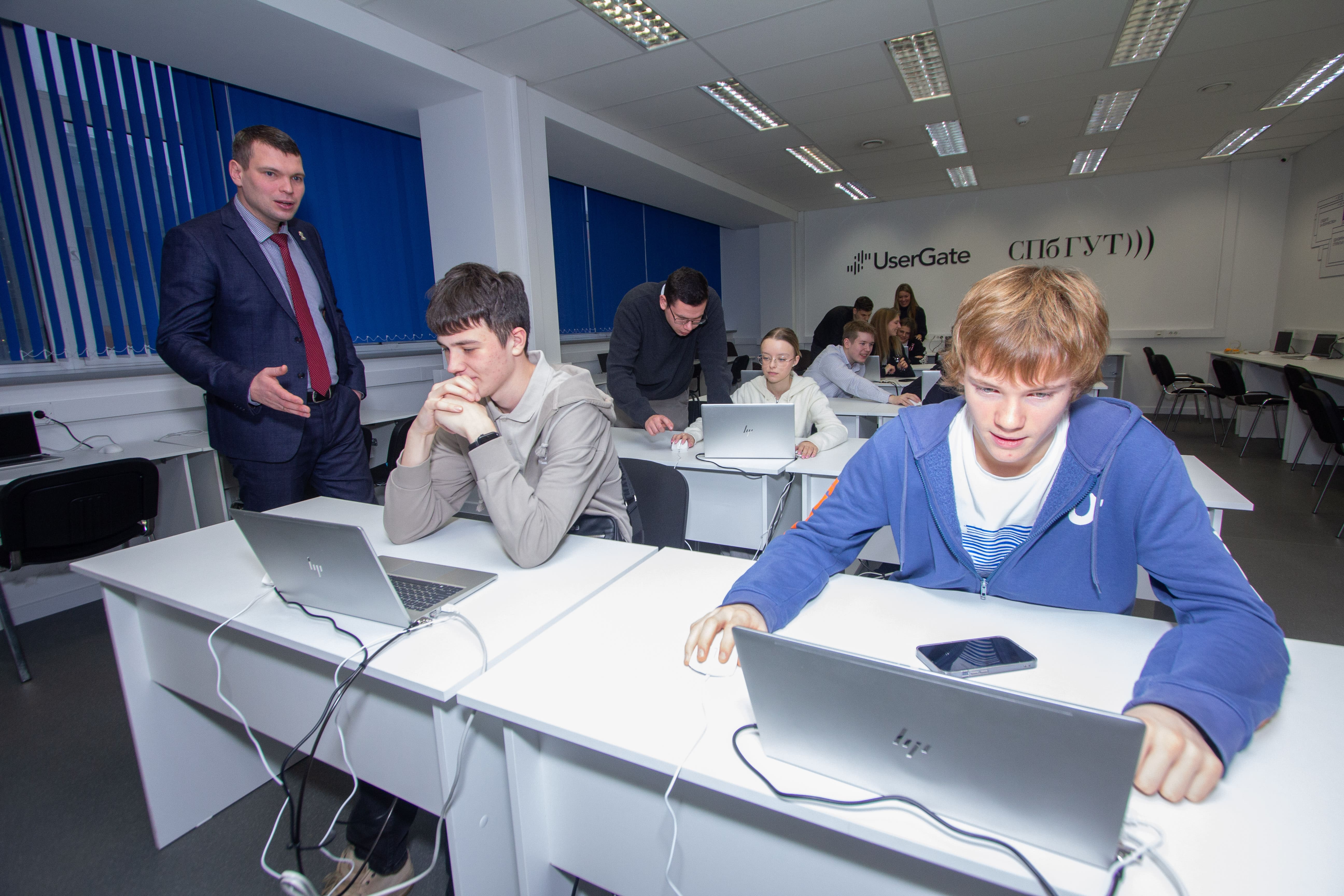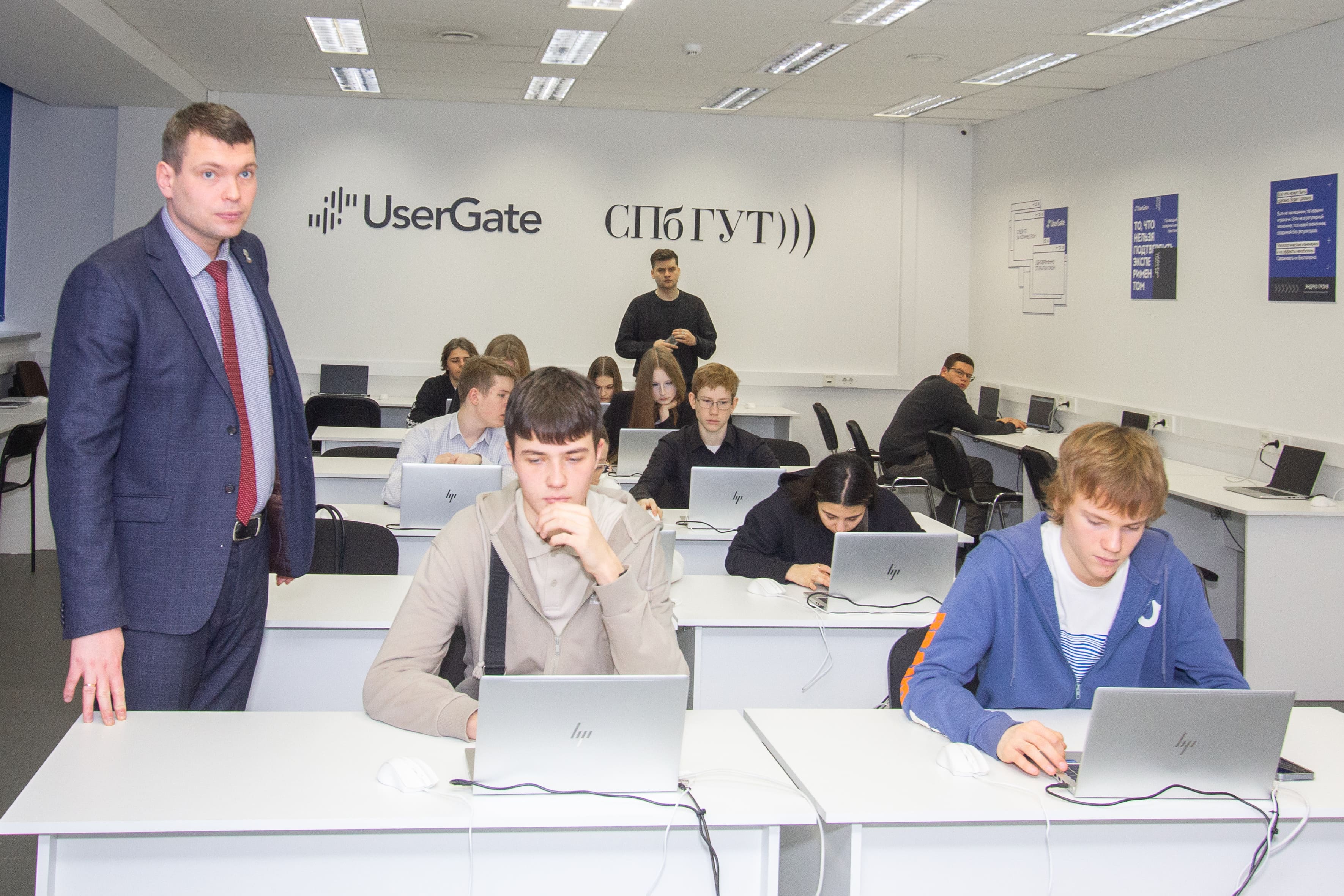 И. о. заведующего кафедрой информационной безопасности компьютерных сетей, к. т. н. Игорь Ушаков рассказал о факультете кибербезопасности СПбГУТ и о сотрудничестве вуза с компанией UserGate. Он поделился, как проходит рабочий день администратора сетевой безопасности, продемонстрировал ребятам практические навыки. Школьники, которые проявили наибольший интерес к теме и глубокие знания в области ИБ, получили памятные подарки от UserGate.