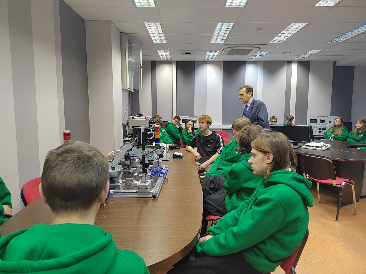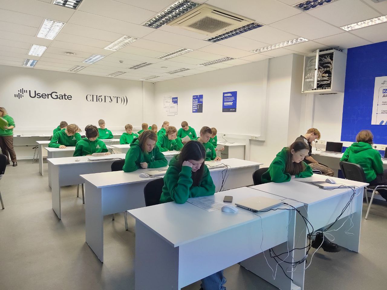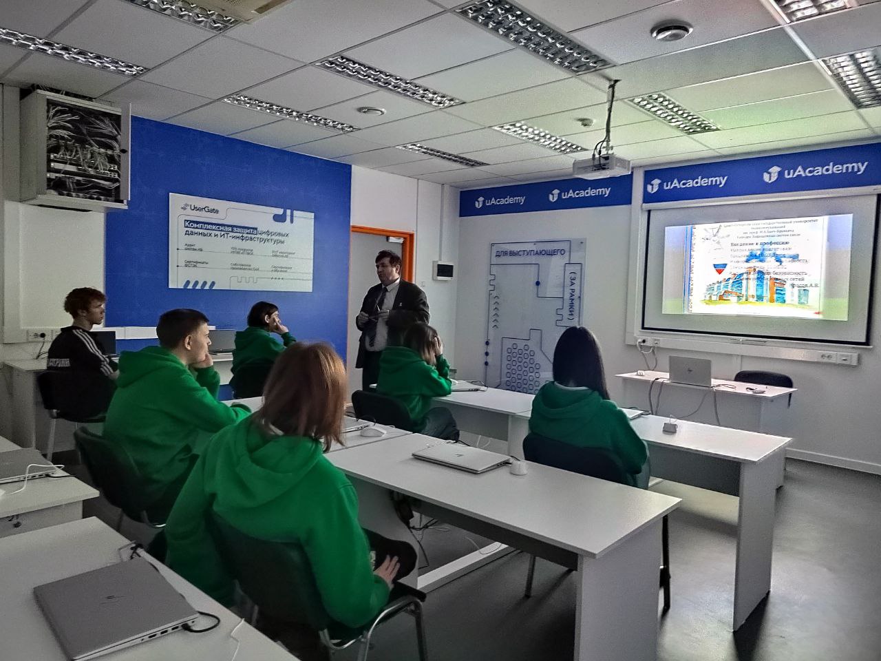 В учебно-исследовательской лаборатории UserGate заведующий кафедрой ЗСС Андрей Красов рассказал школьникам о перспективных направлениях в сфере информационной безопасности и об обучении на факультете кибербезопасности в СПбГУТ.