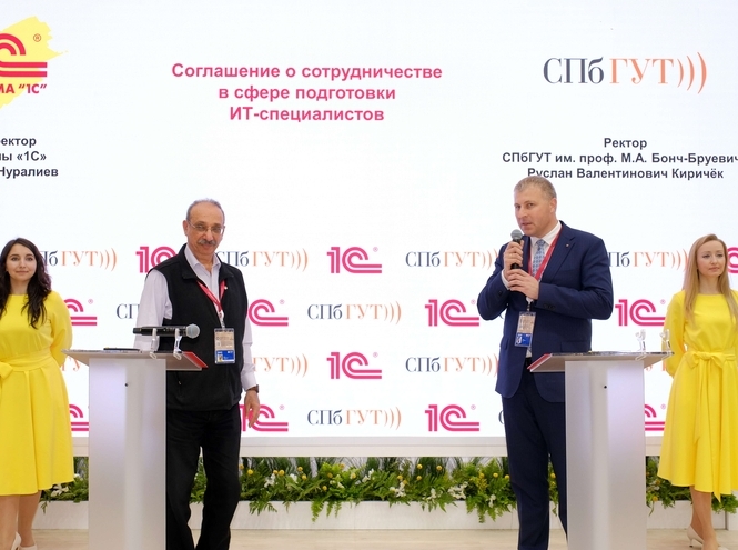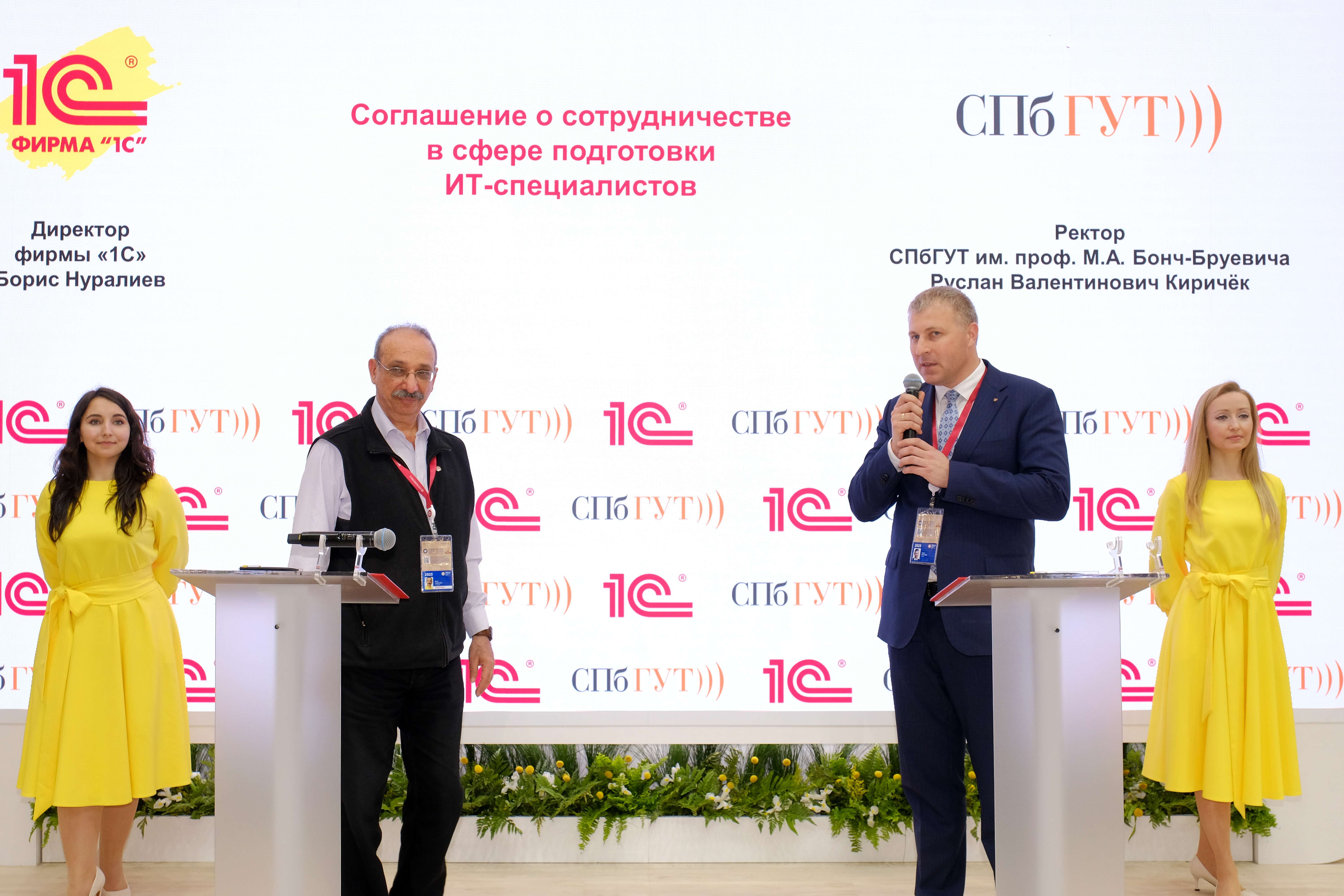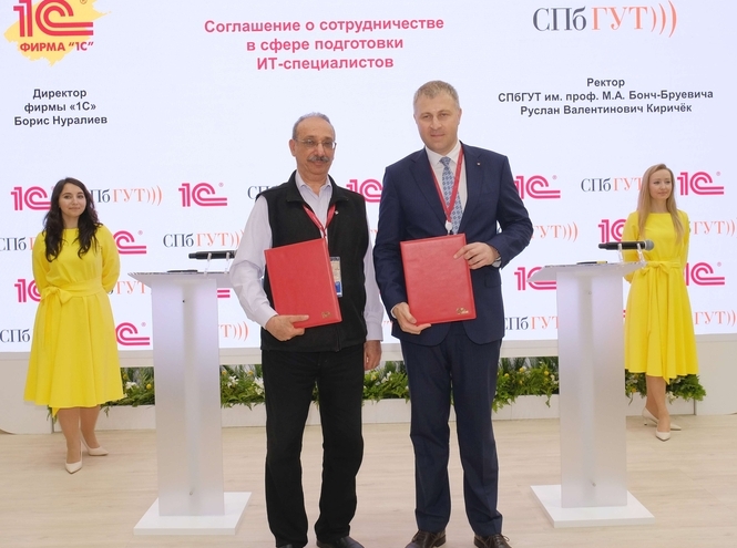 На Петербургском международном экономическом форуме ректор Санкт-Петербургского университета телекоммуникаций Руслан Киричёк и директор фирмы «1С» Борис Нуралиев подписали соглашение о сотрудничестве в сфере подготовки ИТ-специалистов. Ключевым проектом в рамках соглашения станет создание в СПбГУТ Центра Технологий 1С.