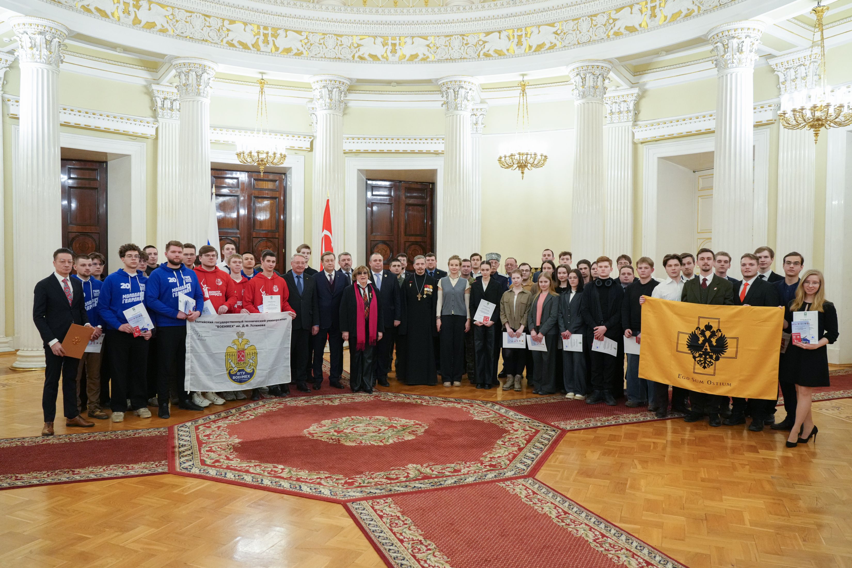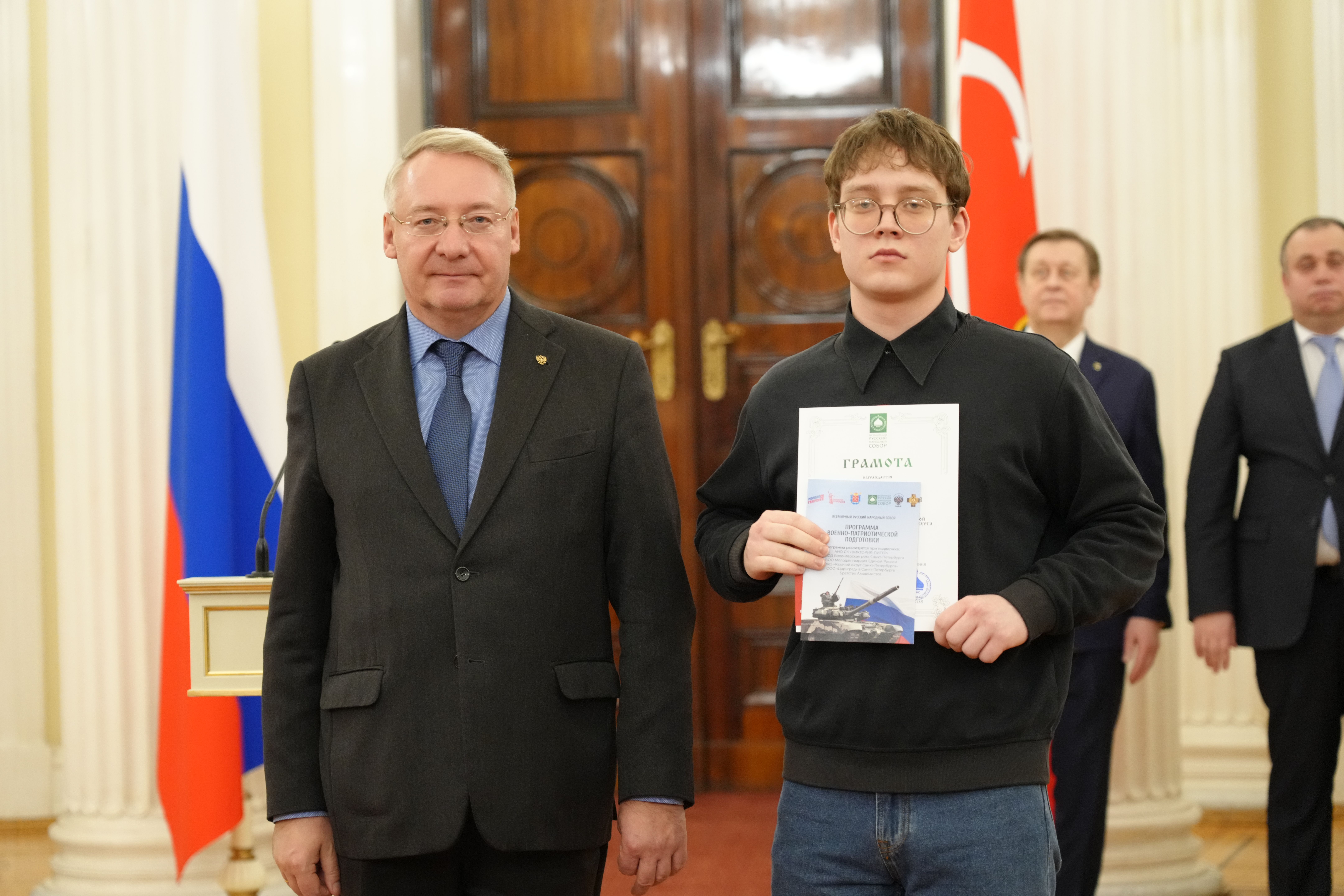 12 февраля в Ротонде Мариинского дворца состоялась церемония награждения участников городской программы по начальному военно-патриотическому воспитанию молодежи до 18 лет. Среди них были студенты Санкт-Петербургского колледжа телекоммуникаций им. Э. Т. Кренкеля Иван Петров и Анна Финк.
