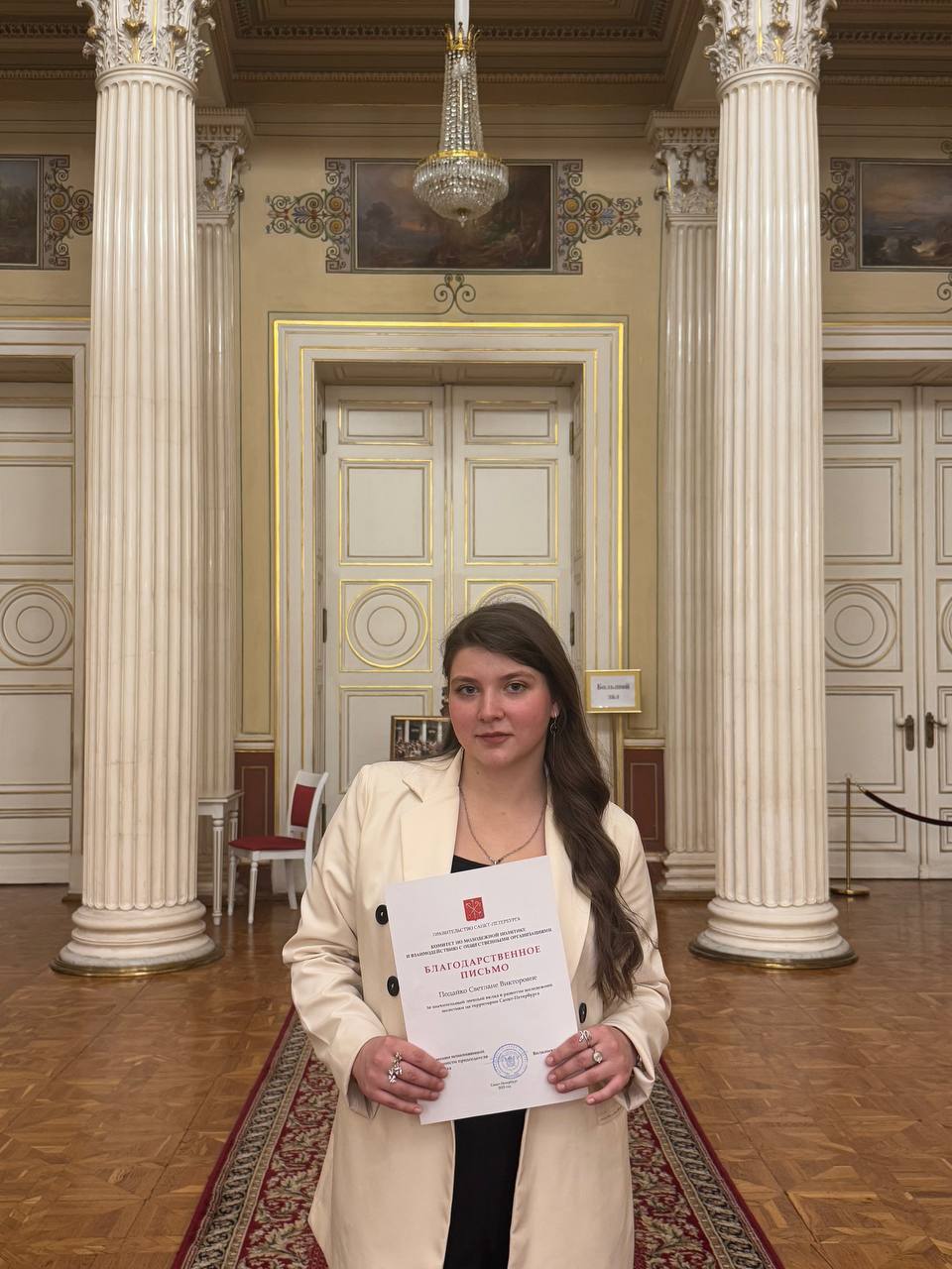 Награду за значительный личный вклад в развитие молодёжной политики Светлане Подайко вручил заместитель председателя комитета по молодёжной политике и взаимодействию с общественными организациями Иван Есипов в здании Законодательного собрания Санкт-Петербурга.