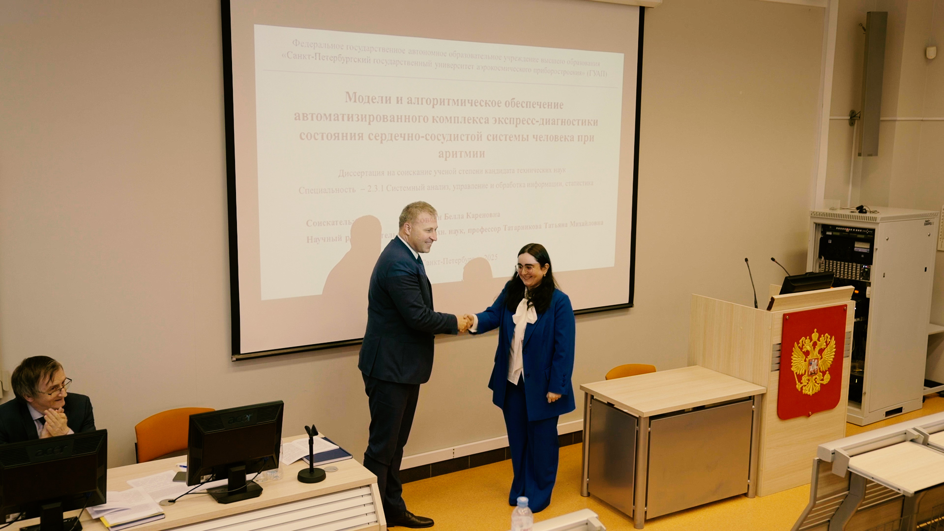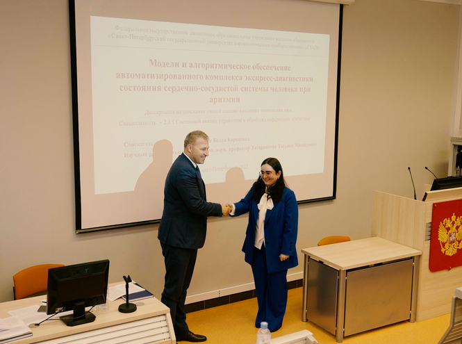 25 июня 2025 года на заседании диссертационного совета 99.2.038.03, созданного на базе Балтийского государственного технического университета «ВОЕНМЕХ» им. Д.Ф. Устинова, Санкт-Петербургского государственного университета аэрокосмического приборостроения, Санкт-Петербургского государственного университета телекоммуникаций им. проф. М.А. Бонч-Бруевича, Акопян Белла Кареновна, старший преподаватель кафедры прикладной информатики Санкт-Петербургского государственного университета аэрокосмического приборостроения, защитила диссертацию на соискание учёной степени кандидата технических наук на тему «Модели и алгоритмическое обеспечение автоматизированного комплекса экспресс-диагностики состояния сердечно-сосудистой системы человека при аритмии» по специальности 2.3.1. Системный анализ, управление и обработка информации, статистика.