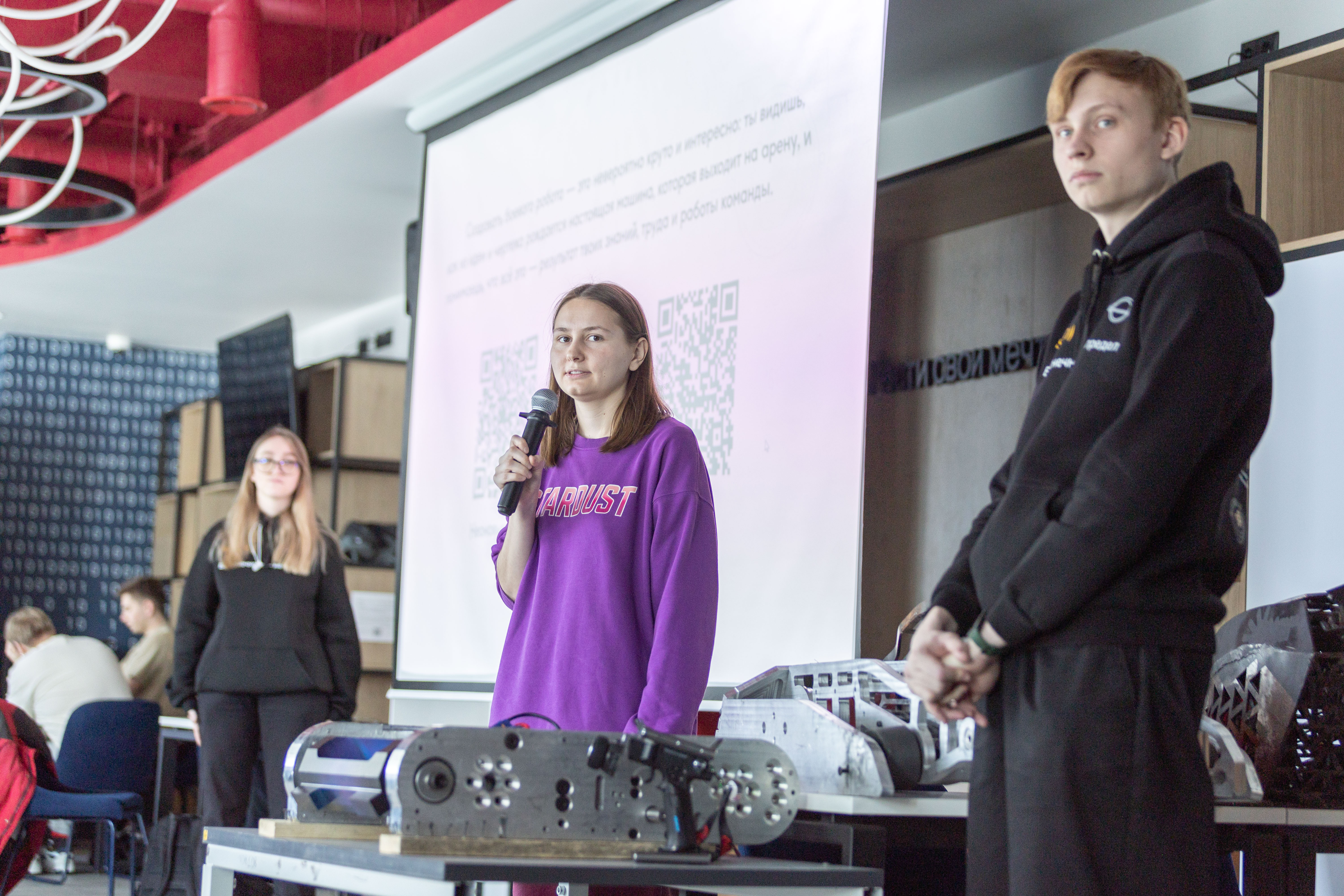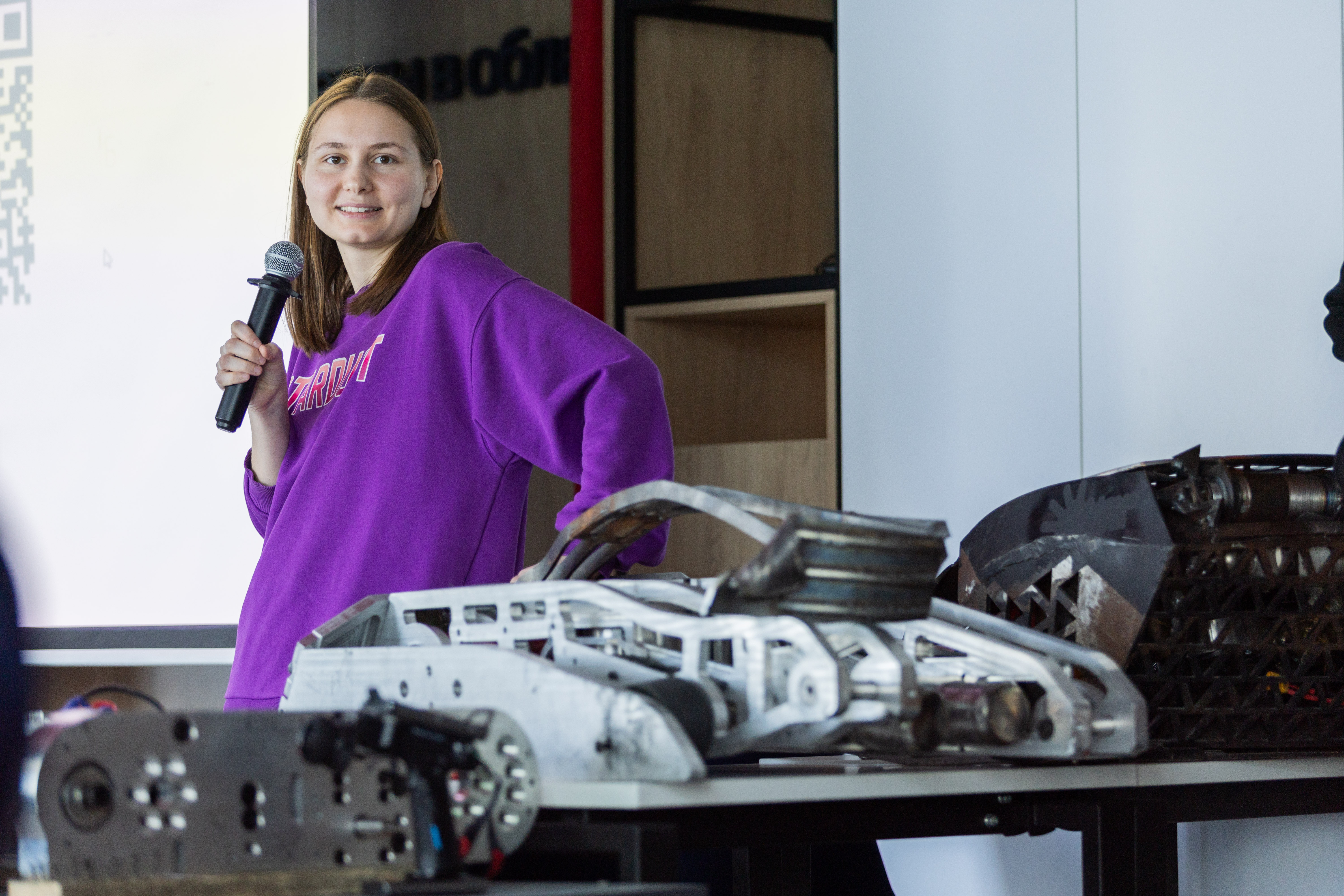 Спикерами стали разработчики команды СПбГУТ, которая участвует в «Битве роботов» с 2024 года. Анастасия Золотухина, Алёна Харлова и Кирилл Балан. Они поделились опытом реализации инженерных проектов, представили полный цикл создания боевого робота: от выбора концепции до выхода на арену.