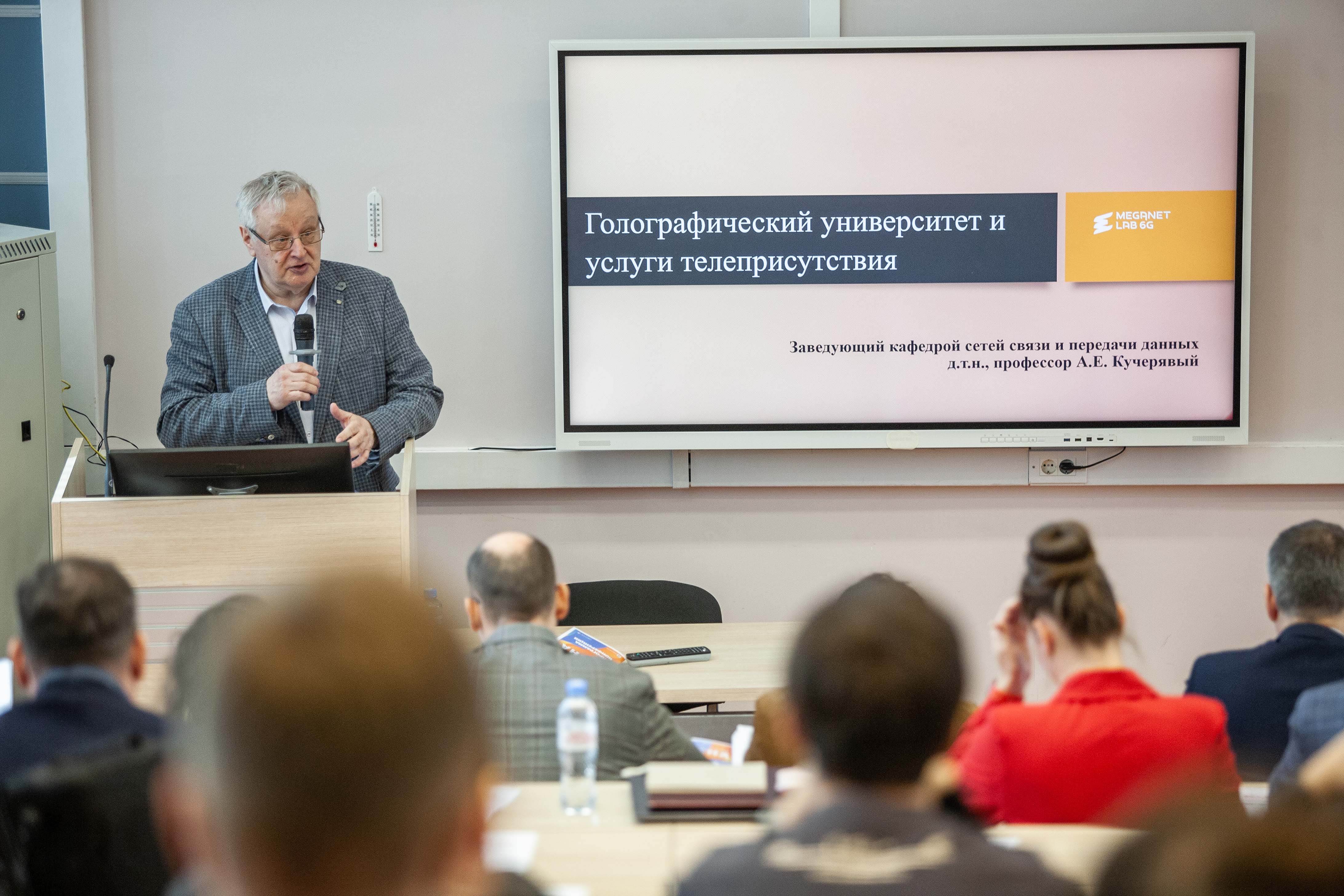 Здесь выступили первый проректор — проректор по учебной работе СПбГУТ Альберт Абилов, проректор по научной работе, директор центра специальных проектов СПбГУТ Алексей Рабин, заведующий кафедрой СС и ПД Андрей Кучерявый, доцент кафедры СС и ПД, начальник студенческого конструкторского бюро Дмитрий Кукунин, главный специалист службы развития систем связи ФГУП «Космическая связь» Сергей Щепнов, исполнительный директор Национальной ассоциации трансфера технологий по коммерциализации результатов исследований и разработок молодых учёных Алексей Филимонов.