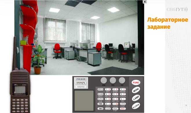 В лабораторном стенде имеется тренировочный программный макет по радиоперехвату и аппаратный комплекс состоящий из устройства HасkRF оnе + Роrtарасk. Разработан для тестирования и разработки современных радиотехнологий и технологий следующего поколения.