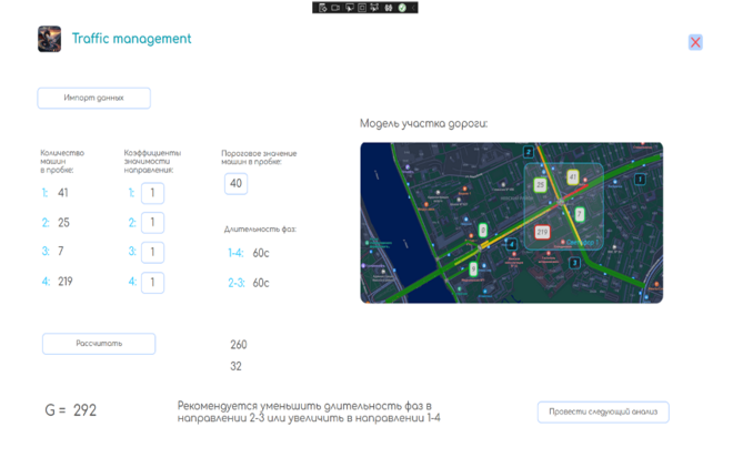 Разрабатываемая система направлена на оптимизацию длительности фазы светофоров в зависимости от загруженности дорожной сети с целью повышения её пропускной способности. Современные системы управления дорожным трафиком, как правило, нацелены на жесткую установку длительности фазы в зависимости от временного периода, что делает их неадаптивными к текущим дорожным ситуациям, а это, в свою очередь, в значительной мере влияет на количество заторов.