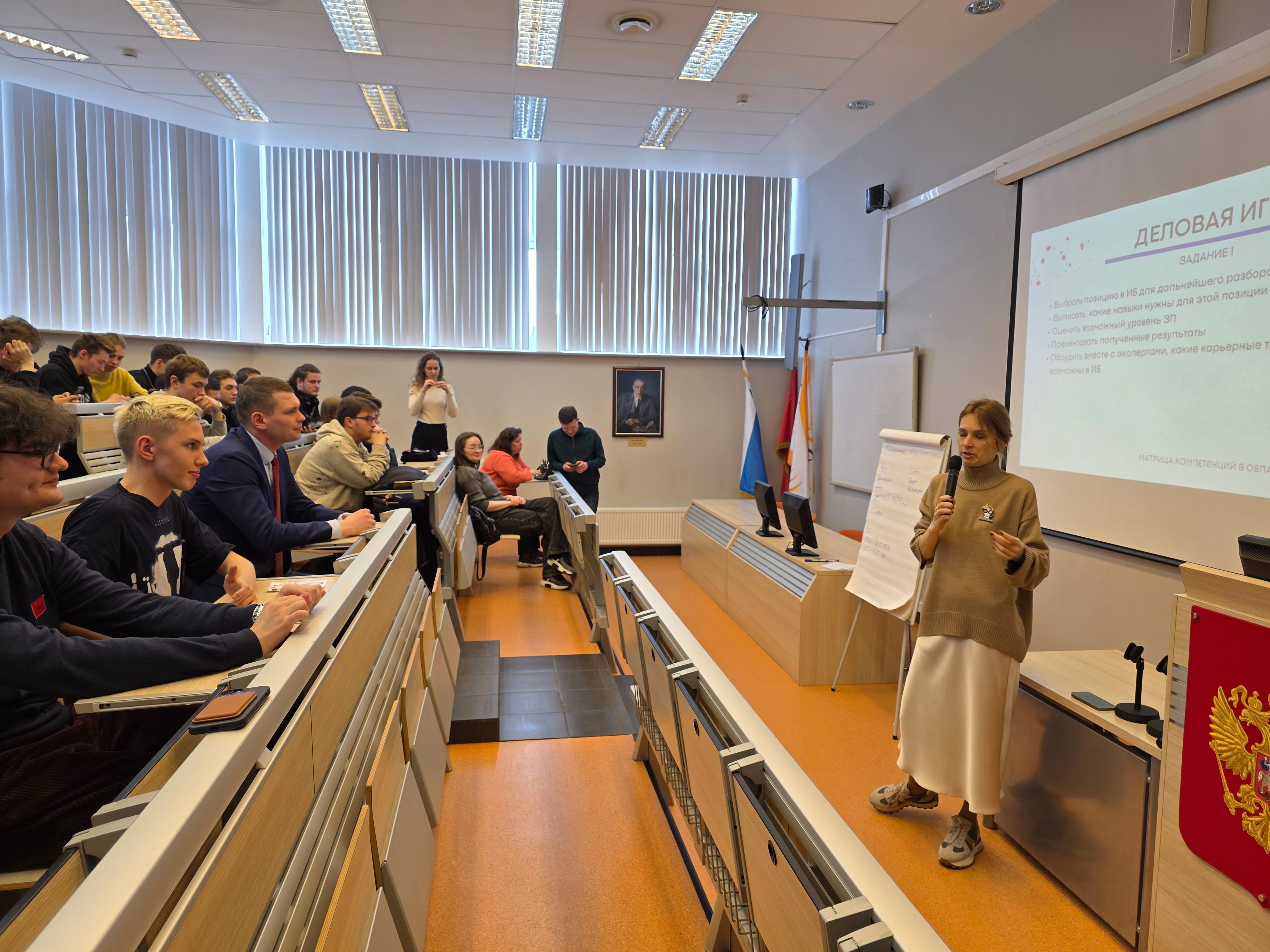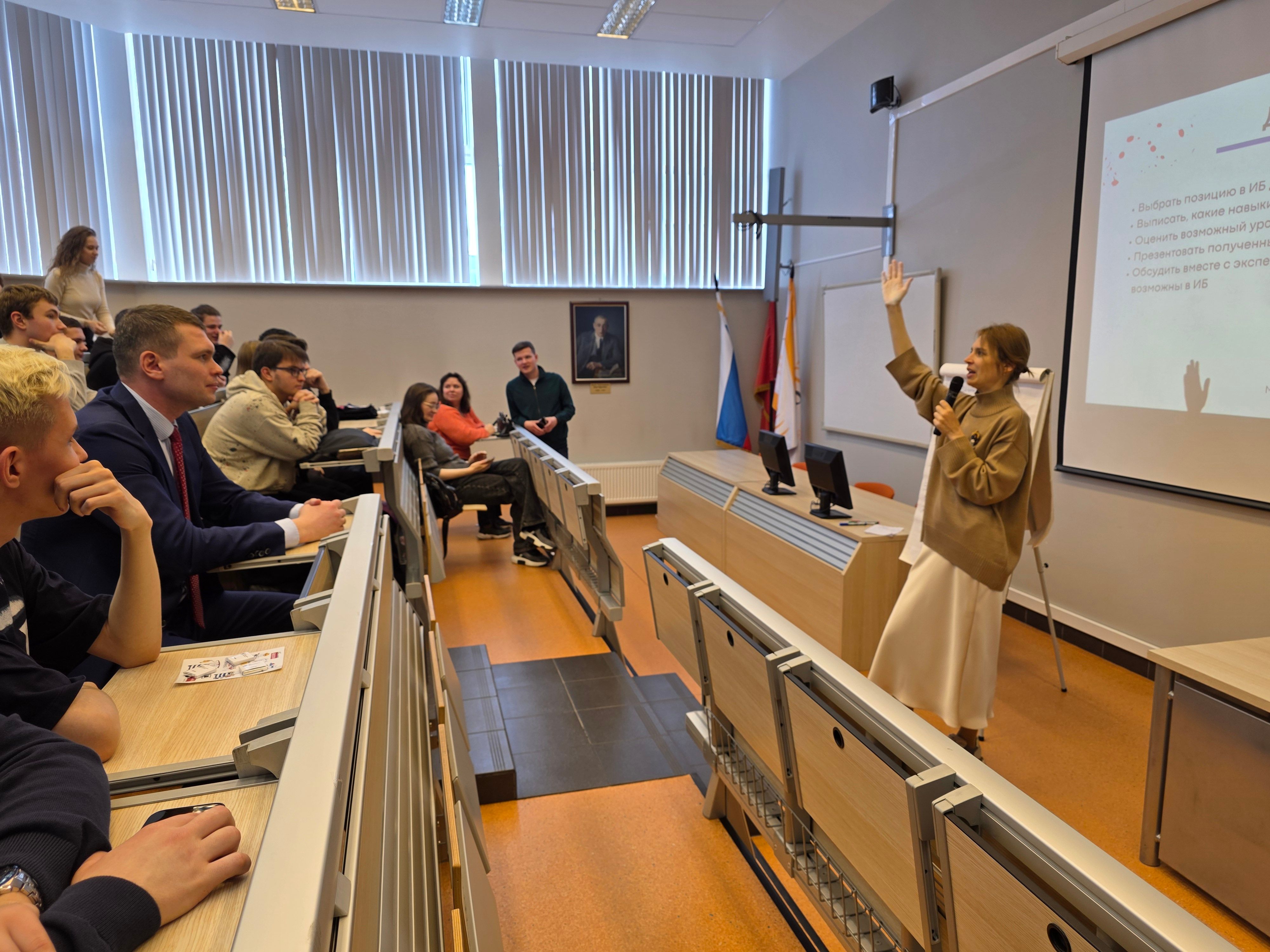CEO и продюсер проекта «КОД ИБ» Ольга Поздняк выступила с презентацией и познакомила студентов с направлениями работы в области ИБ. Она же провела деловую игру.