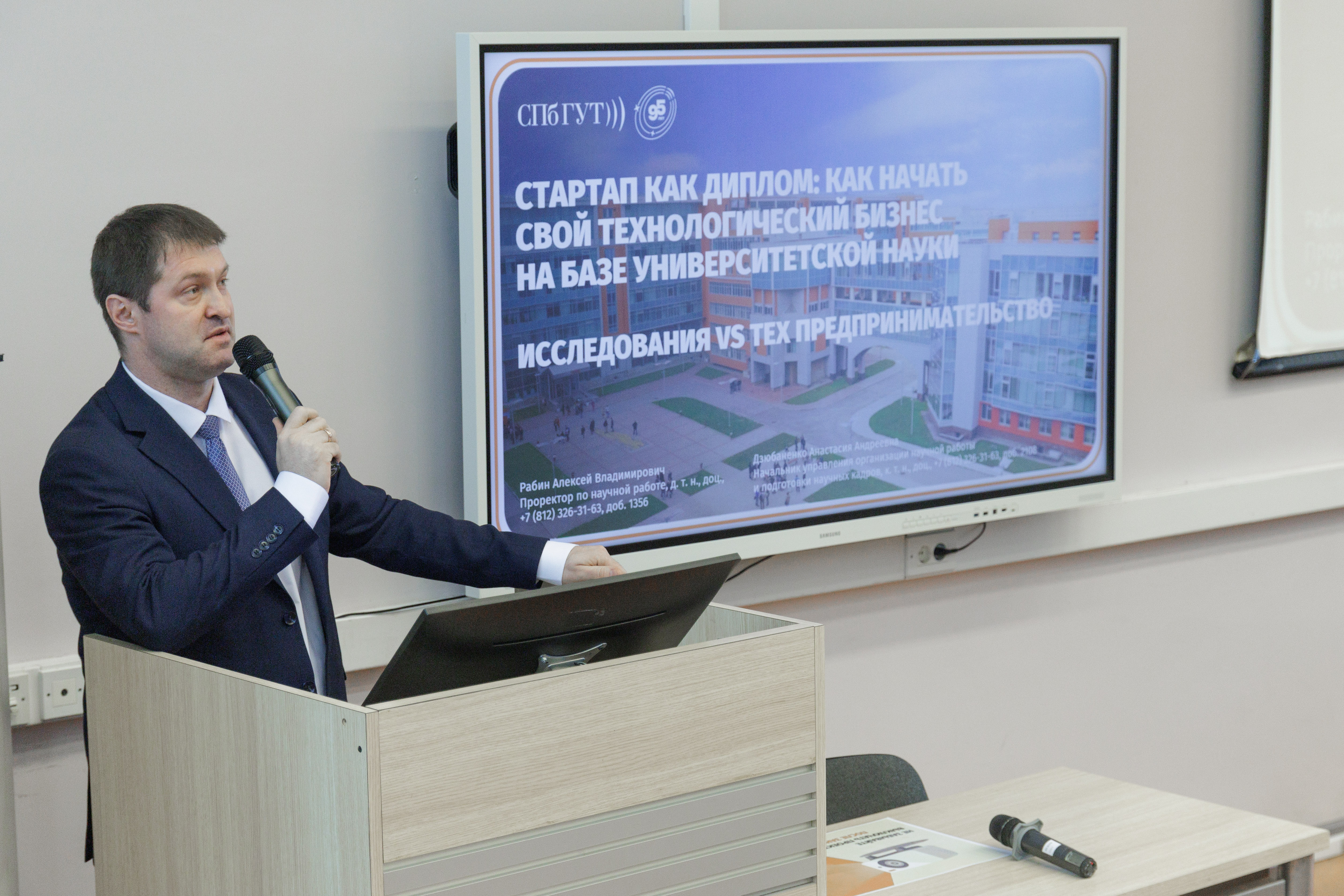 Проректор по научной работе, д. т. н., доцент Алексей Рабин в своем выступлении поделился со слушателями информацией о стартапах, их стадиях и способах реализации, и рассказал о возможности участия в научных конкурсах, грантах и конвенциях.