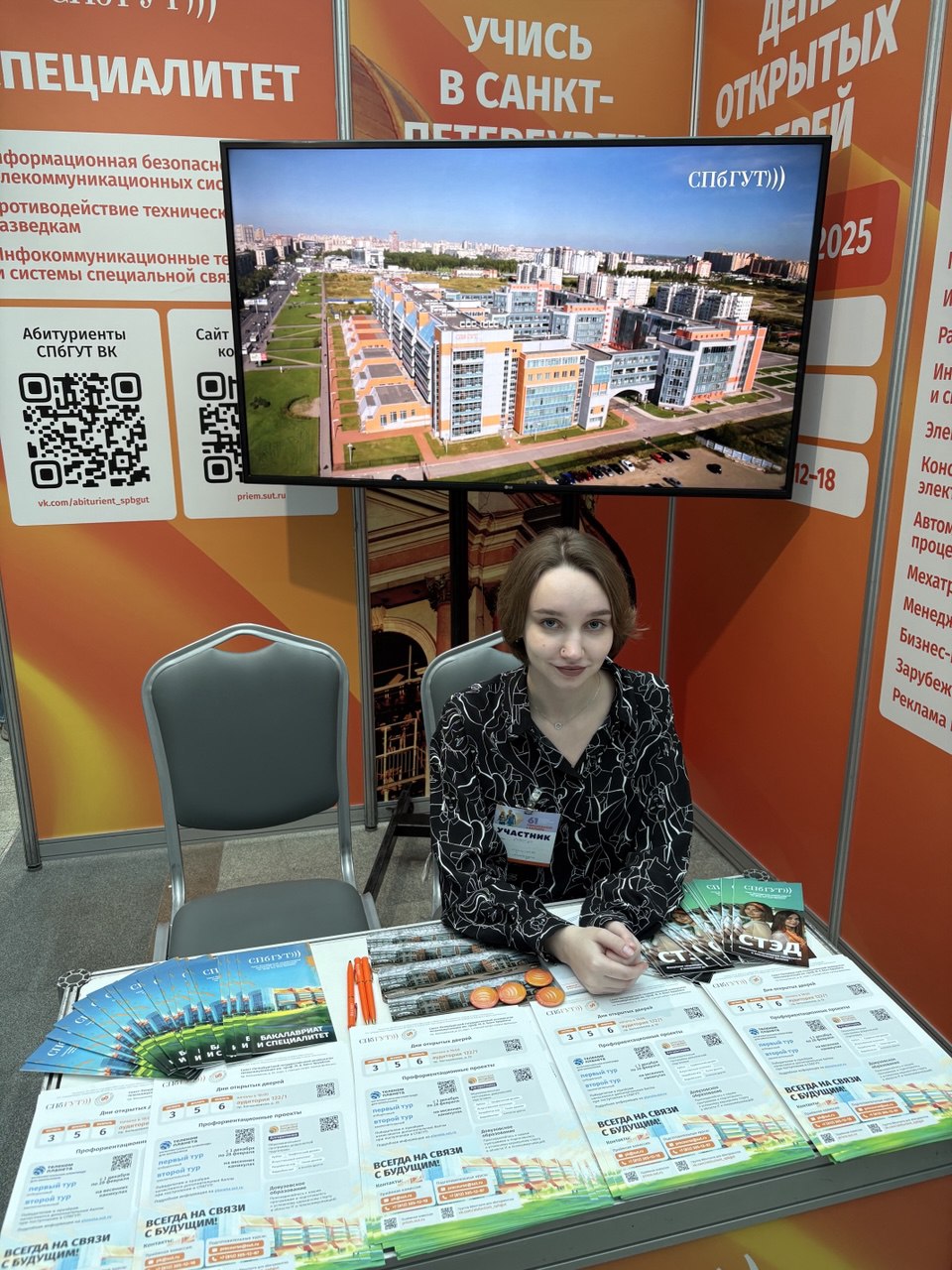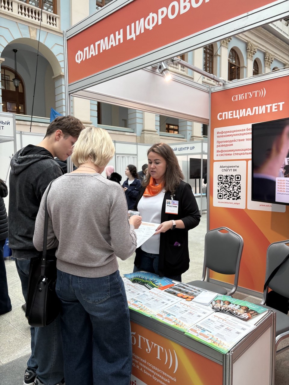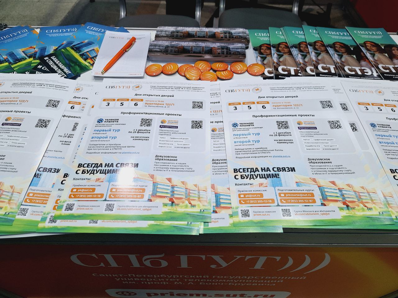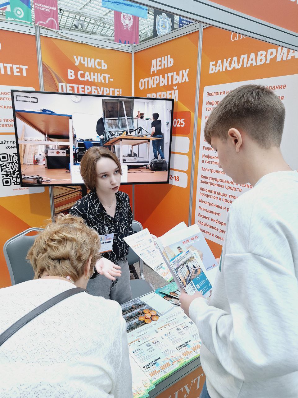 На стенде СПбГУТ работают специалисты отдела профориентации и организации приёма. Среди посетителей — старшеклассники со всей страны, многие планируют поступать в технические вузы.