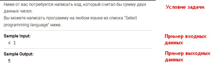Условие задачи, как правило, состоит из двух частей: описания задачи и примеров входных и выходных данных. Этих примеров может быть несколько.