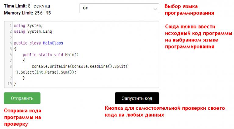 Под окном с редактором кода находятся две кнопки: «Отправить» (слева) и «Запустить код» (справа). После попытки решения рекомендуется сначала нажимать на кнопку «Отправить», по которой код можно проверить, вводя различные входные данные в появившемся текстовом окне.