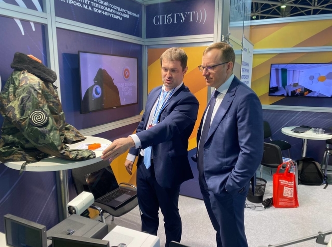 Он ознакомился с разработками СПбГУТ. Об экспонатах и достижениях университета рассказали и. о. проректора по научной работе Алексей Рабин и проректор по проектной деятельности Дарина Окунева.