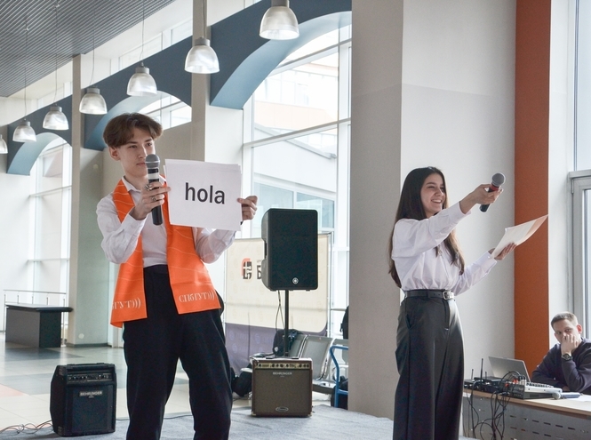 Студенты группы ИКБ-32 Николай Емельянов, Ирина Буркова, Дмитрий Тульчинский показали сценку на английском языке "On the Cosmodrome, или BonchTranslator".