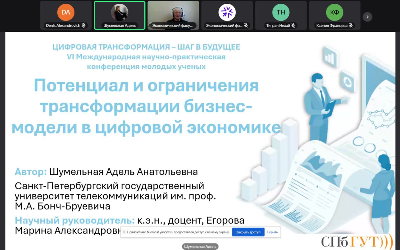 2 октября в Минске прошла VI Международная научно-практическая конференция молодых учёных «Цифровая трансформация — шаг в будущее», организованная кафедрой цифровой экономики Белорусского государственного университета. Студентка 4 курса группы ЭМ-21 факультета социальных технологий и экономики данных СПбГУТ Адель Шумельная выступила с докладом в онлайн-формате.