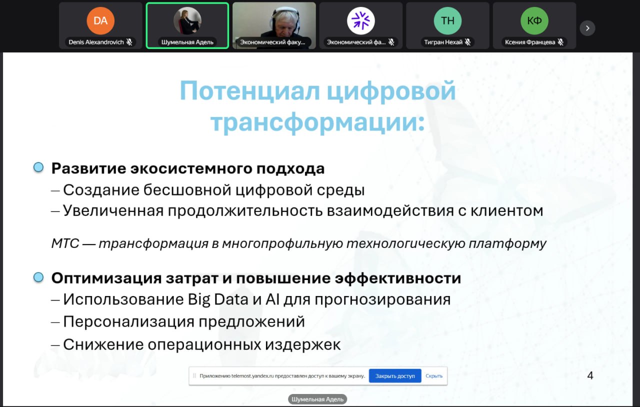 Адель представила доклад «Потенциал и ограничения трансформации бизнес-модели в цифровой экономике» на секции «IT-проекты и технологические инновации в условиях цифровой трансформации индустриального сектора». Работа была подготовлена под руководством к. э. н., доцента кафедры экономики данных Марины Егоровой.