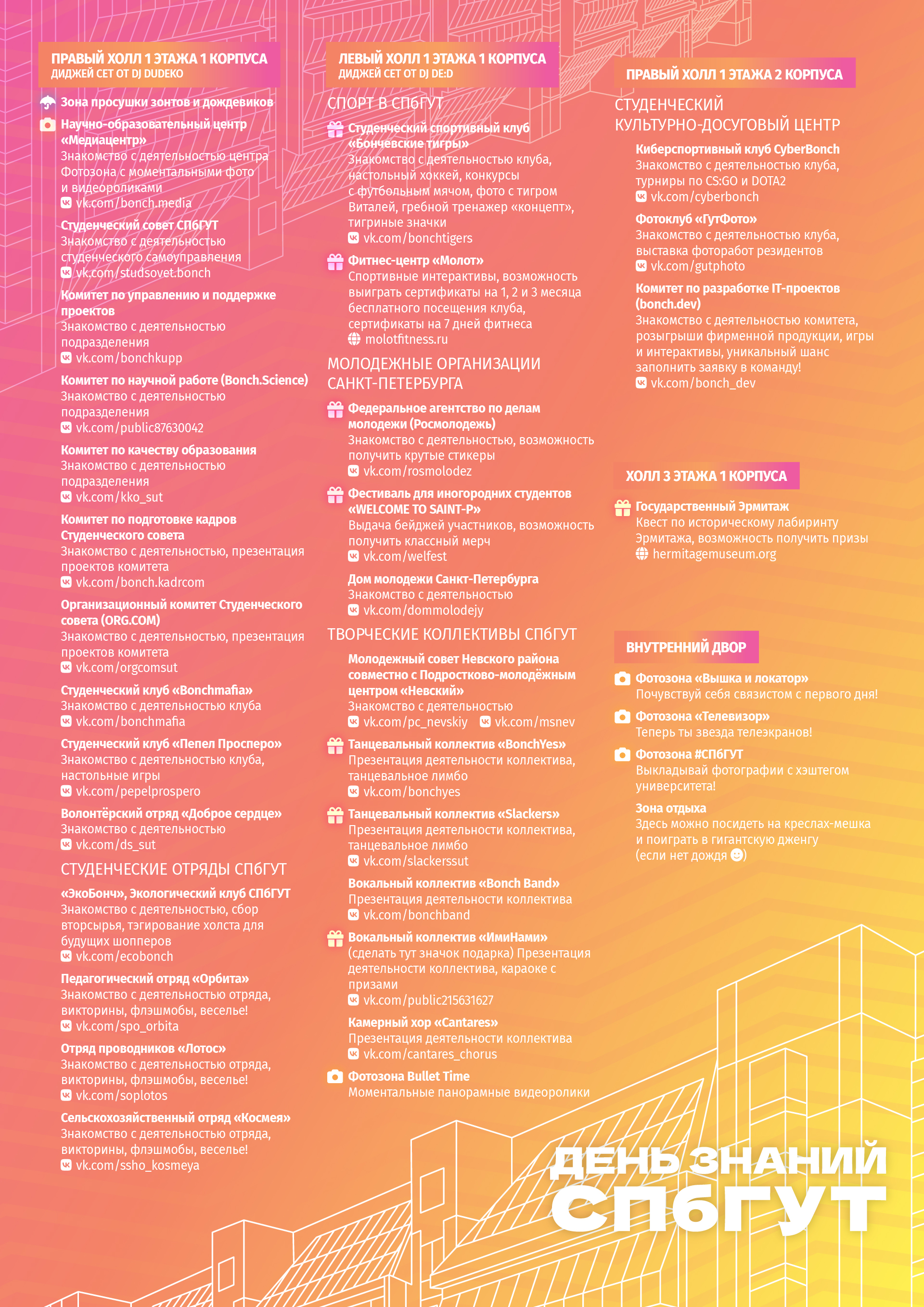 В 11:30 начнется сбор первокурсников. Место встречи – перед входом в университет (служебная парковка, парк 85-летия СПбГУТ). Ребята познакомятся со своими кураторами и одногруппниками, получат значок #БОНЧ и зарядятся хорошим настроением под диджей-сет. С 12:00 – вход гостей во внутренний двор университета.