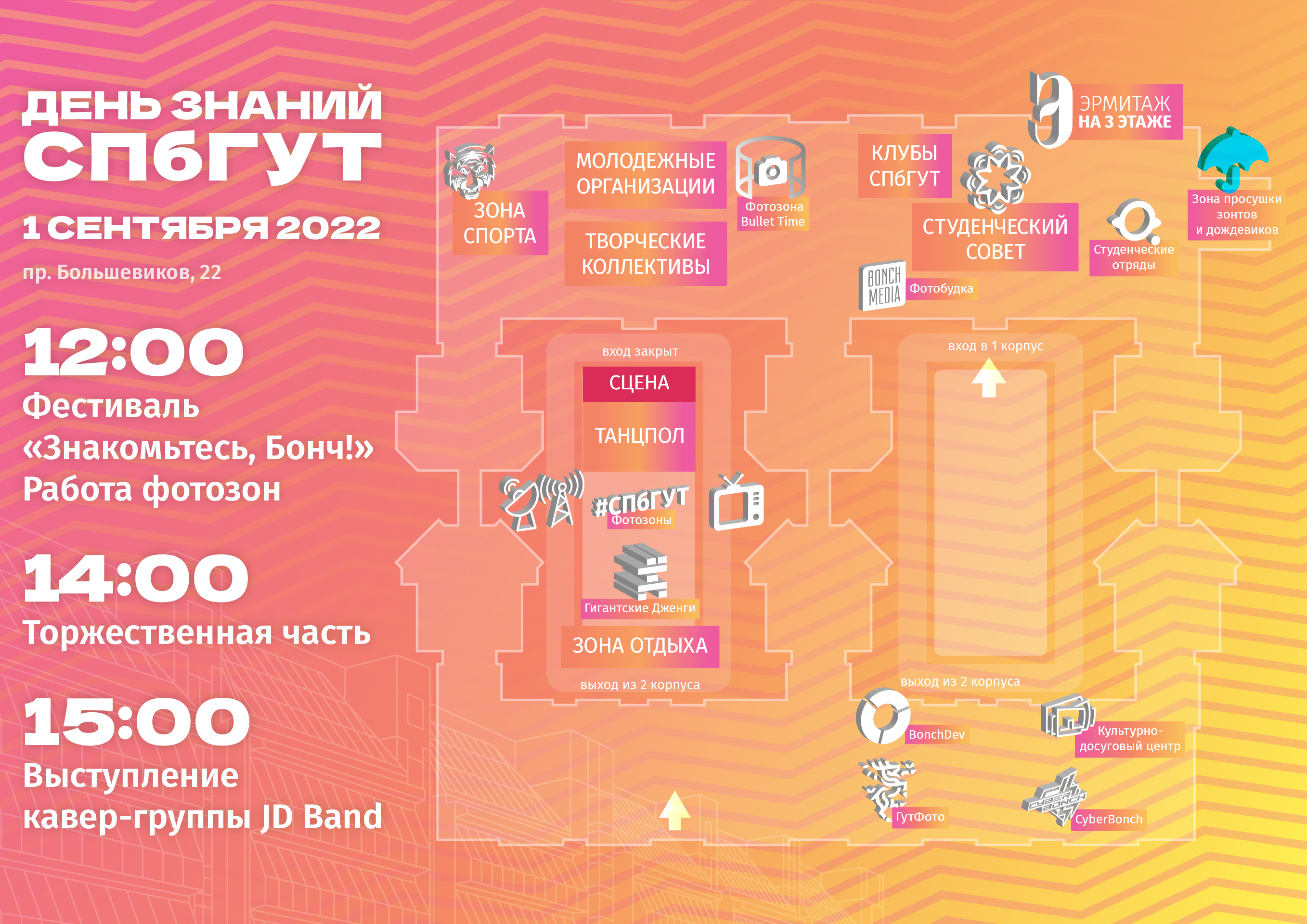 Праздник пройдет в четверг, 1 сентября 2022 года, на территории главного корпуса СПбГУТ (ст. м. Улица Дыбенко, пр. Большевиков, 22).
