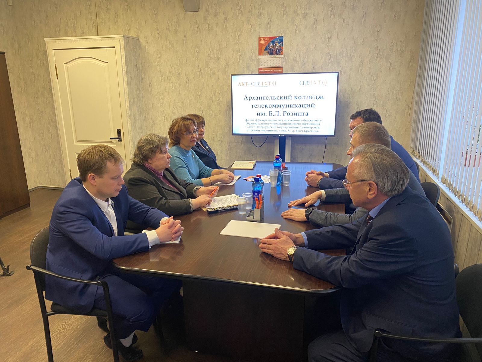 3 февраля делегация СПбГУТ побывала в столице Поморья. Ректор университета Руслан Киричек с советником по прикладным проектам Юрием Гурьевым и проректором по административно-хозяйственной деятельности Артемом Николаевым встретились с руководством и сотрудниками Архангельского колледжа телекоммуникаций им. Б. Л. Розинга – филиала СПбГУТ.