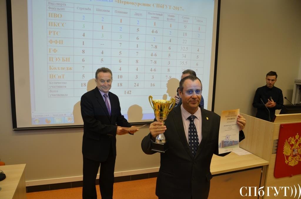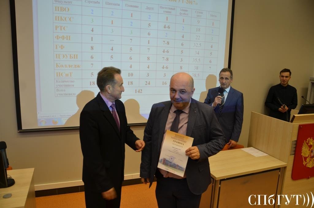 • награждение кубком и грамотой за 1 место института военного образования, грамотой за 2 место факультета инфокоммуникационных сетей и систем и грамотой за 3 место факультета радиотехнологий связи по итогам Спартакиады «Первокурсник СПбГУТ-2017»