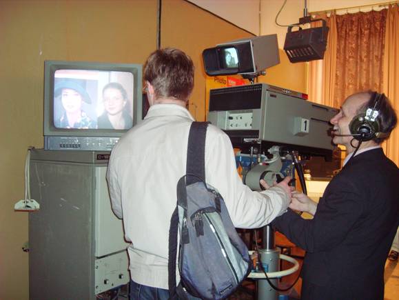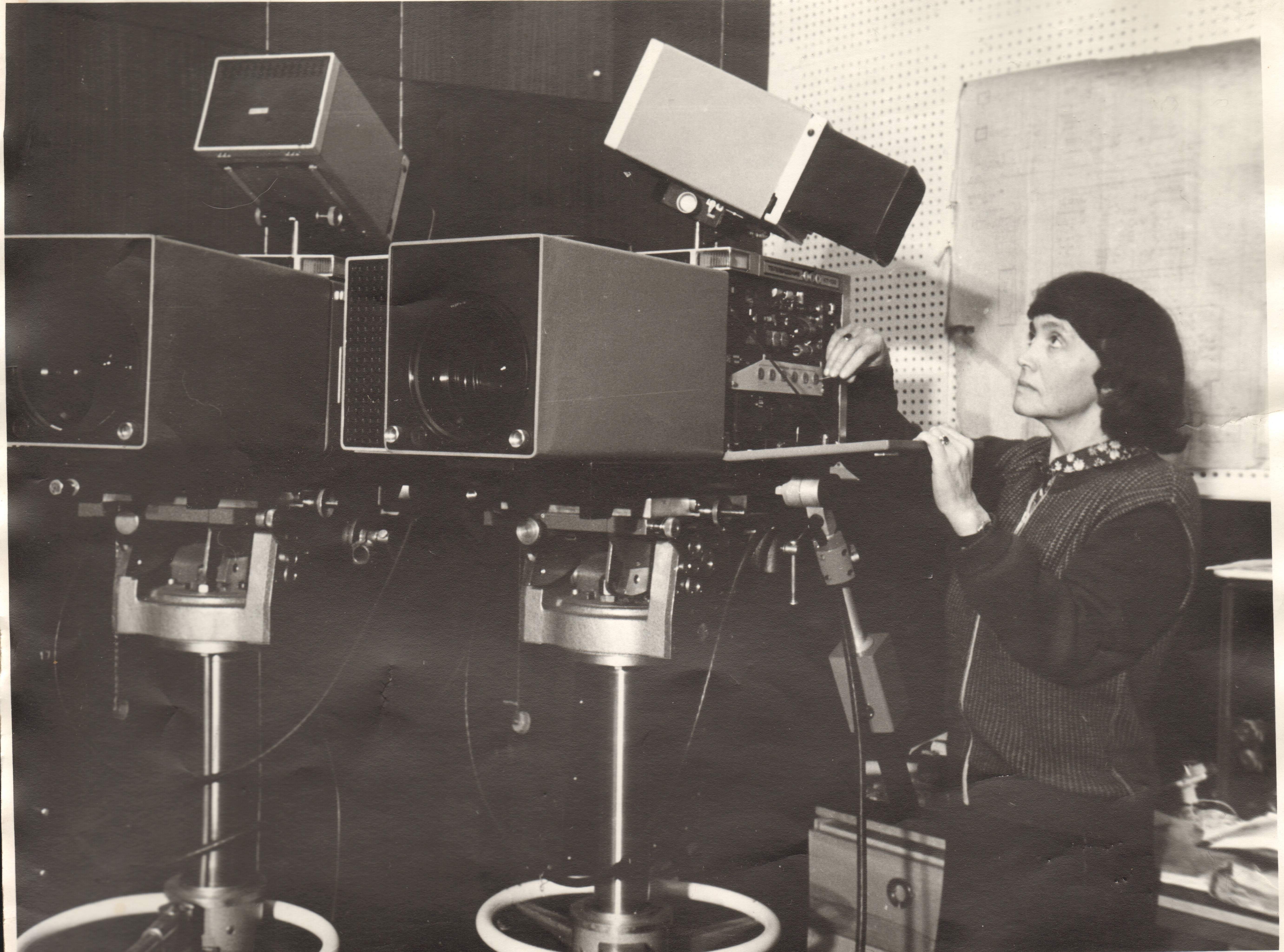 3 фотография – Е. Дубинина рядом с ТВ камерами, 1987 год.