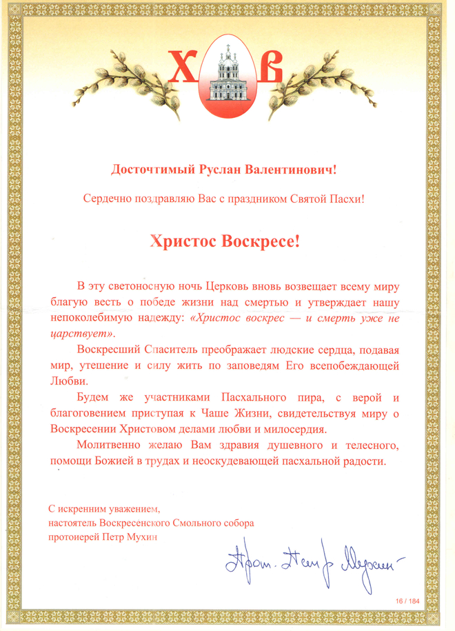 В светлый праздник Пасхи Христовой в адрес ректора Санкт-Петербургского государственного университета телекоммуникаций им. проф. М. А. Бонч-Бруевича Руслана Киричка поступило торжественное поздравление от настоятеля Воскресенского Смольного собора протоиерея Петра Мухина.
