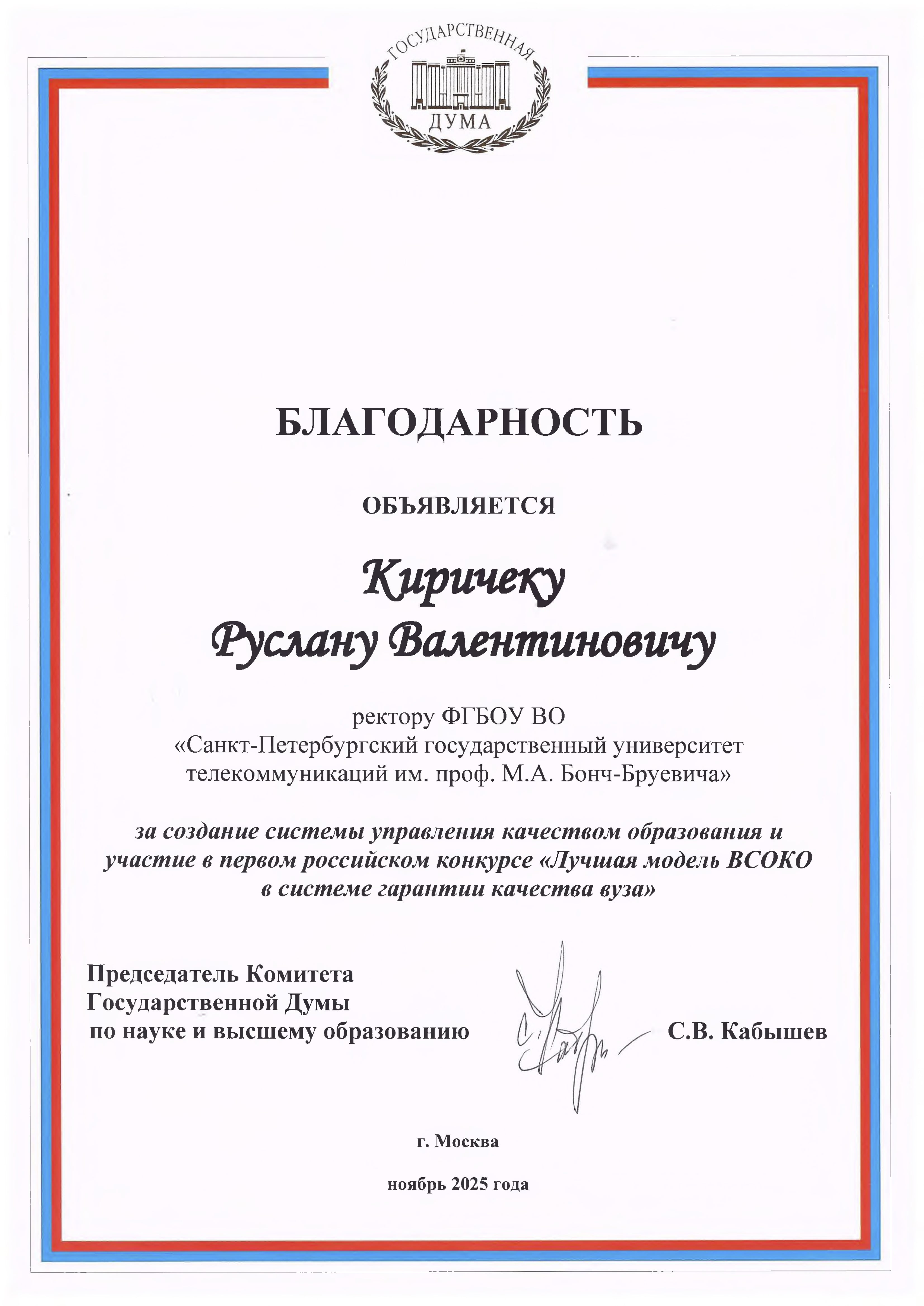 Ректор Санкт-Петербургского университета телекоммуникаций Руслан Киричек получил благодарность Комитета Государственной Думы по науке и высшему образованию за подписью председателя Комитета Сергея Кабышева.