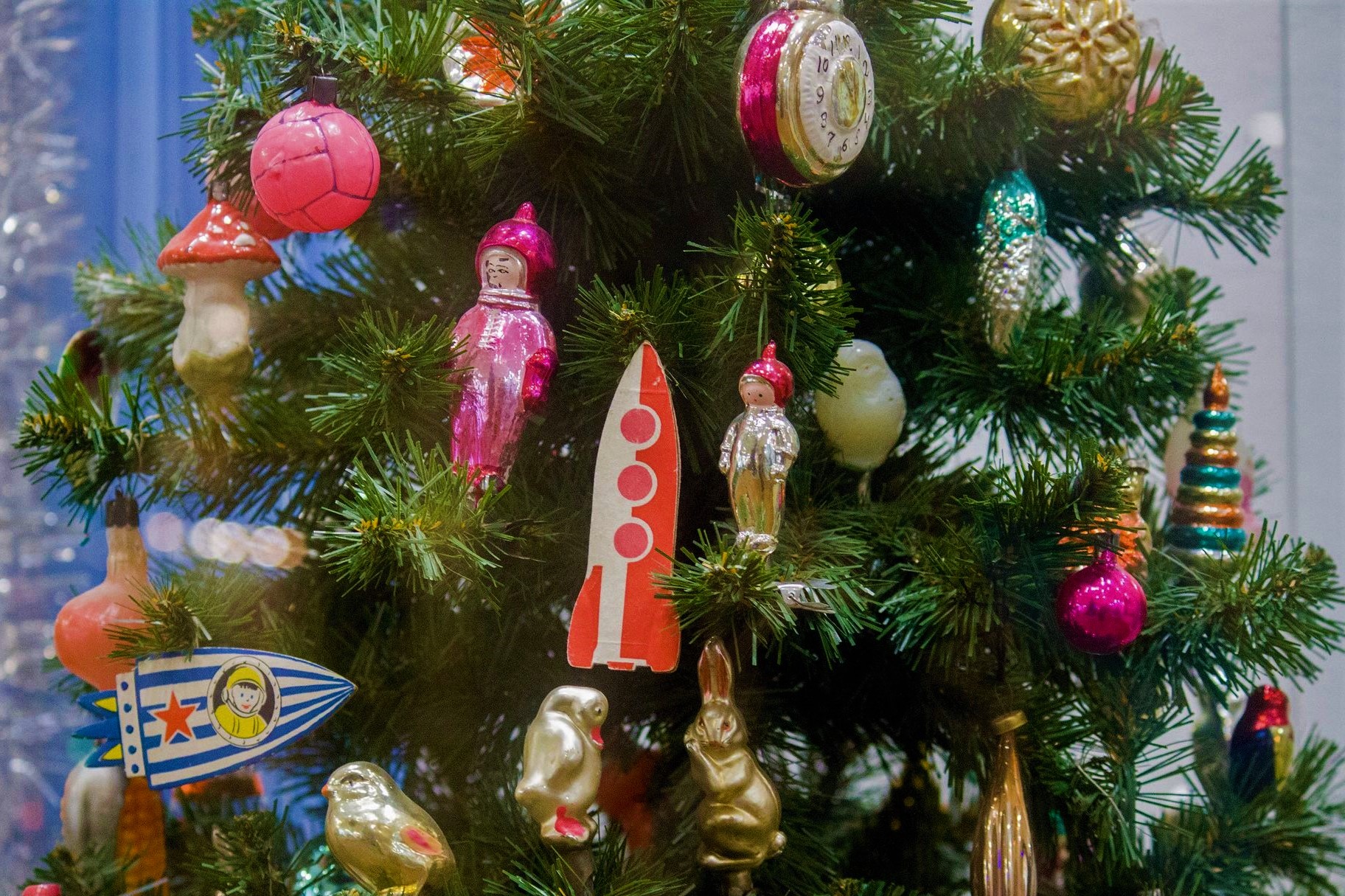 В 1918 году советская власть отменила празднование Нового года с наряженной ёлкой. Лишь в 1936 году традицию восстановили. С тех пор и до конца ХХ века у нас ставили советский вариант ёлки с пятиконечной красной звездой на верхушке. В 60-е годы игрушки были посвящены освоению космоса: спутники, ракеты, космонавты. Позже появились стеклянные овощи, фрукты, шишки, фигурки животных и людей, популярными были серпантин, блестящий дождик, бусы и гирлянды.