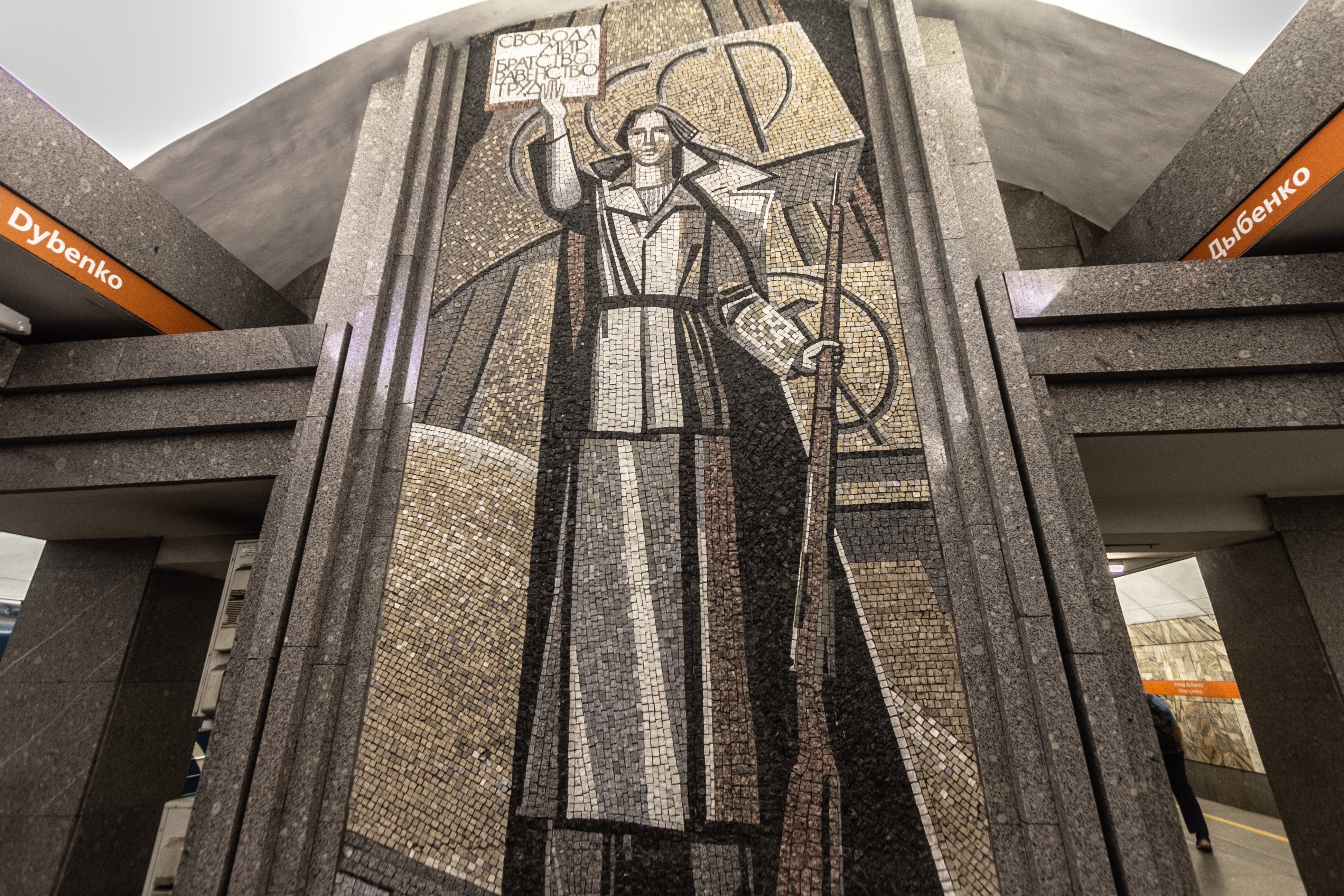 Станция метро «Улица Дыбенко» была открыта 1 октября 1987 года. Тематика художественного оформления станции – идеалы нового мира, воплощённые в конструкции вестибюля, напоминающего древний храм. Финалом анфилады служит мозаичное панно с образом самой Революции. Она выглядит как женщина, одетая в кожаную куртку. На её голове косынка. Это типичные предметы одежды 1917 года. В руках женщины – винтовка и книга. Винтовка символизирует решимость биться и защищать свои идеалы. А сами идеалы зафиксированы в книге на развороте: СВОБОДА МИР БРАТСТВО РАВЕНСТВО ТРУД. Женщина одновременно и величественна словно богиня, и всем своим обликом напоминает революционерку того периода. В этом панно обозначено торжество нового порядка – за спиной Революции мы видим футуристическую композицию нового мира.