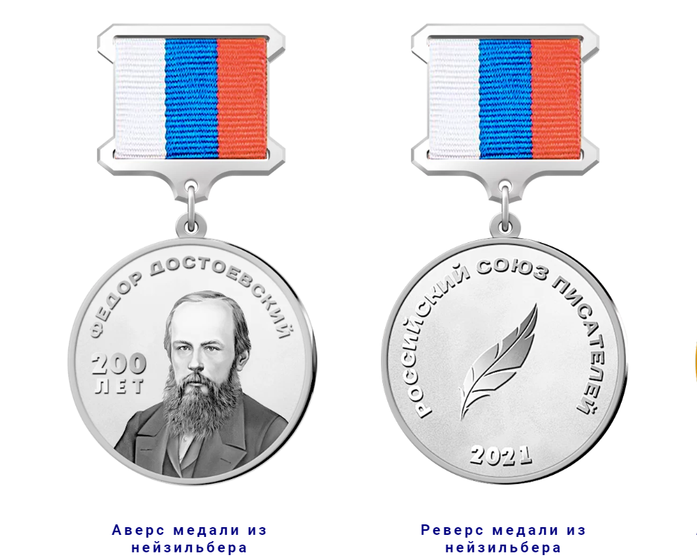 Медаль «Федор Достоевский 200 лет» изготавливается из серебра 925 пробы с нанесением на поверхность чистого золота или из нейзильбера. Диаметр медали – 38 мм. На аверсе медали: портрет Достоевского и надпись «Федор Достоевский 200 лет». На реверсе: изображение пера и надпись «Российский союз писателей», год учреждения медали – 2021. Колодка медали содержит муаровую ленту, состоящую из трех цветов: белого, синего и красного. Медаль носится на левой стороне груди.