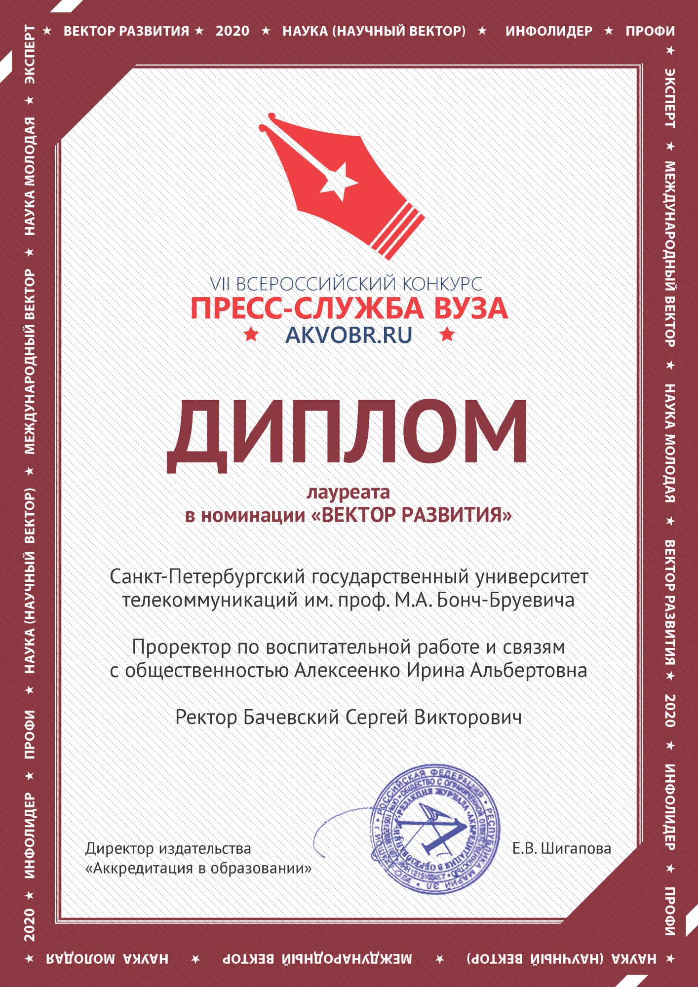 Коллектив УМиР под руководством проректора по воспитательной работе и связям с общественностью Алексеенко Ирины Альбертовны вновь вошел в число победителей VII Всероссийского конкурса «Пресс-служба вузов». СПбГУТ стал одним из лучших в номинации «Вектор развития».
