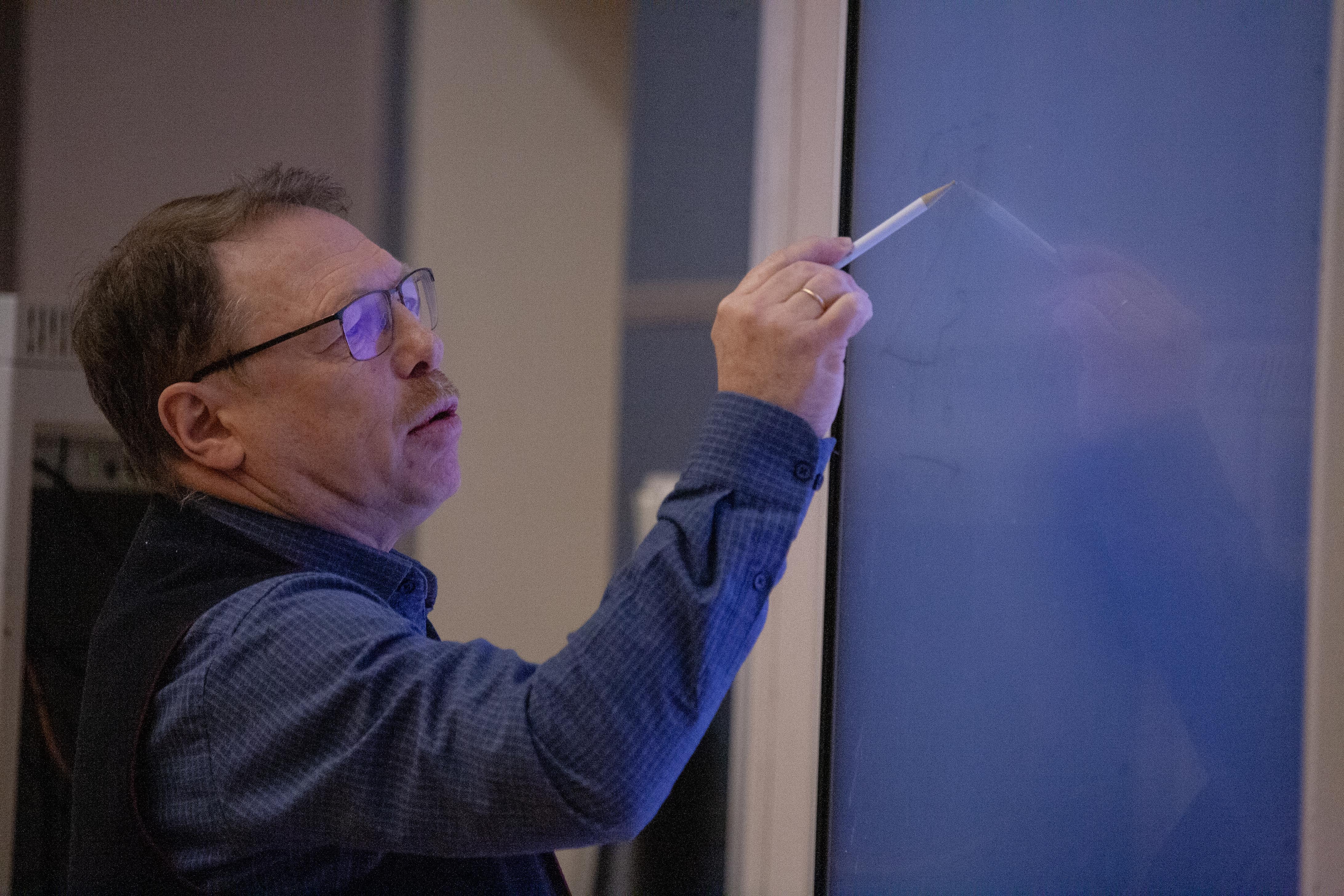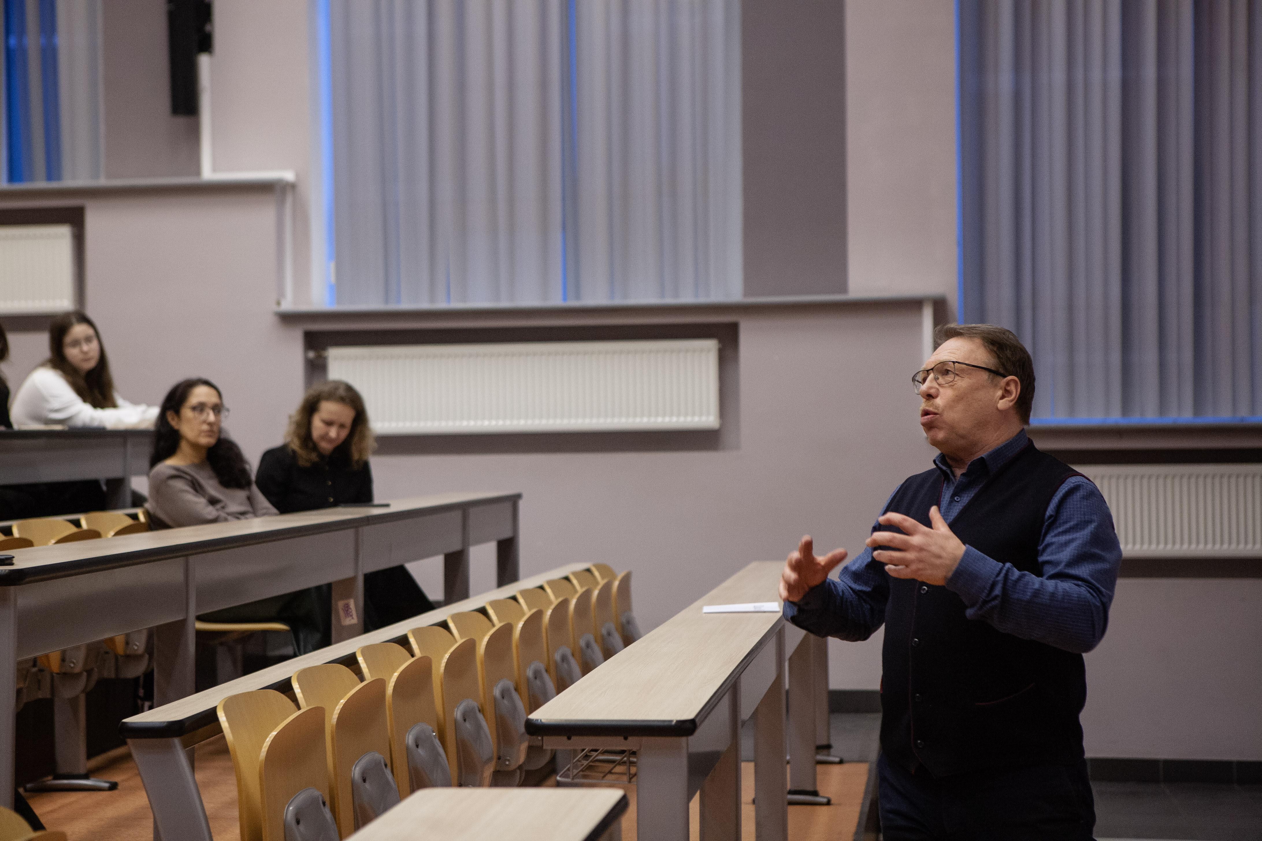 Ребята посетили открытый урок по физике старшего преподавателя кафедры физики СПбГУТ Владимира Федюшина. Он рассказал об авторской методике преподавания физики и математики в физматшколе СПбГУТ, которая проходит в университете каждый год в виде семинаров на весенних и осенних каникулах.