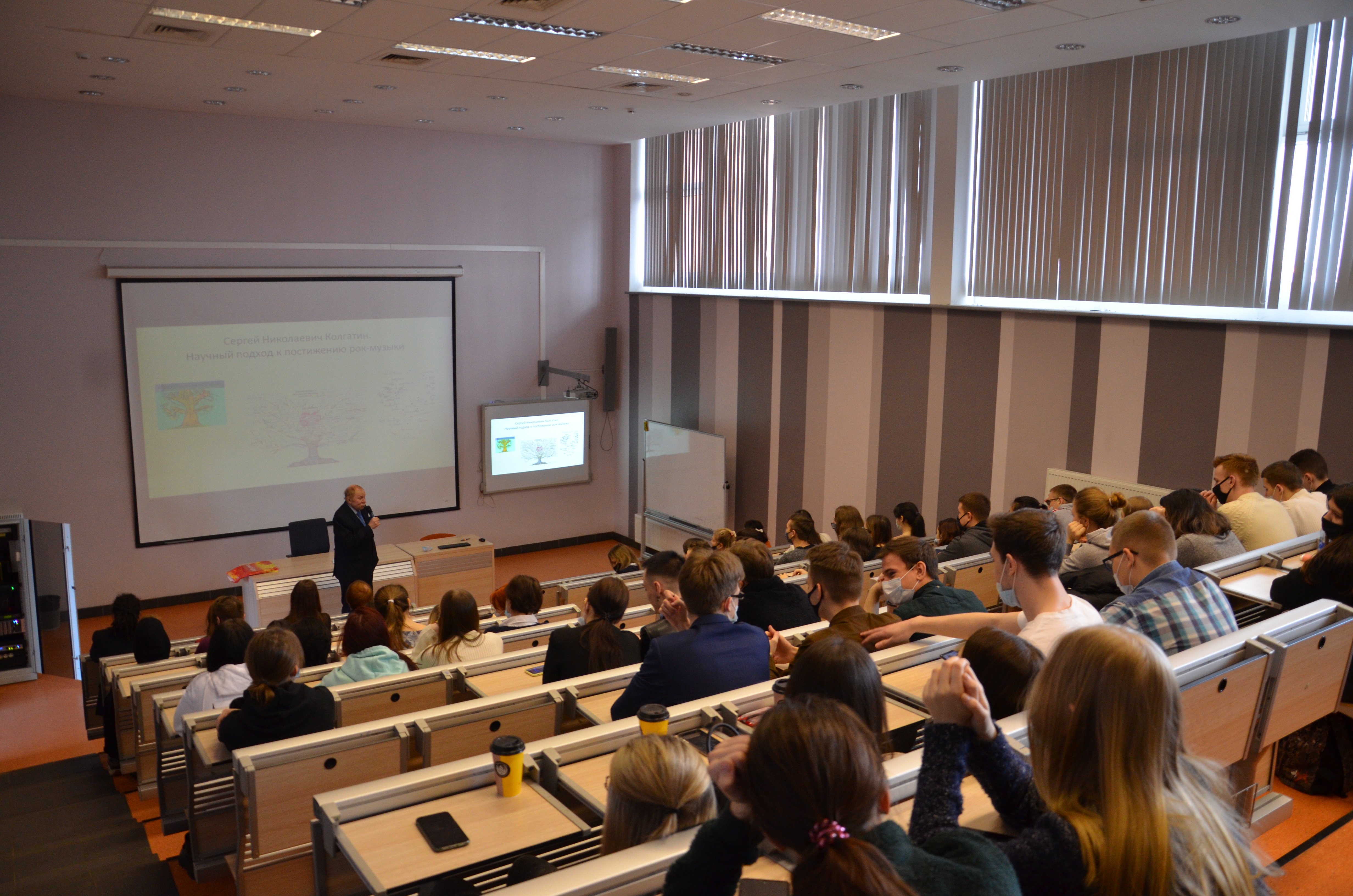В своем выступлении на тему «Научный подход к постижению рок-музыки» Сергей Николаевич рассказал об увлечении рок-музыкой, о любимых группах и исполнителях, привел примеры из собственной жизни. Во второй части доклада наглядно продемонстрировал несколько аналитических, сугубо научных, способов систематизации имеющихся на сегодня знаний о рок-культуре, объединив, казалось бы, несоединимое – рок-музыку и науку.