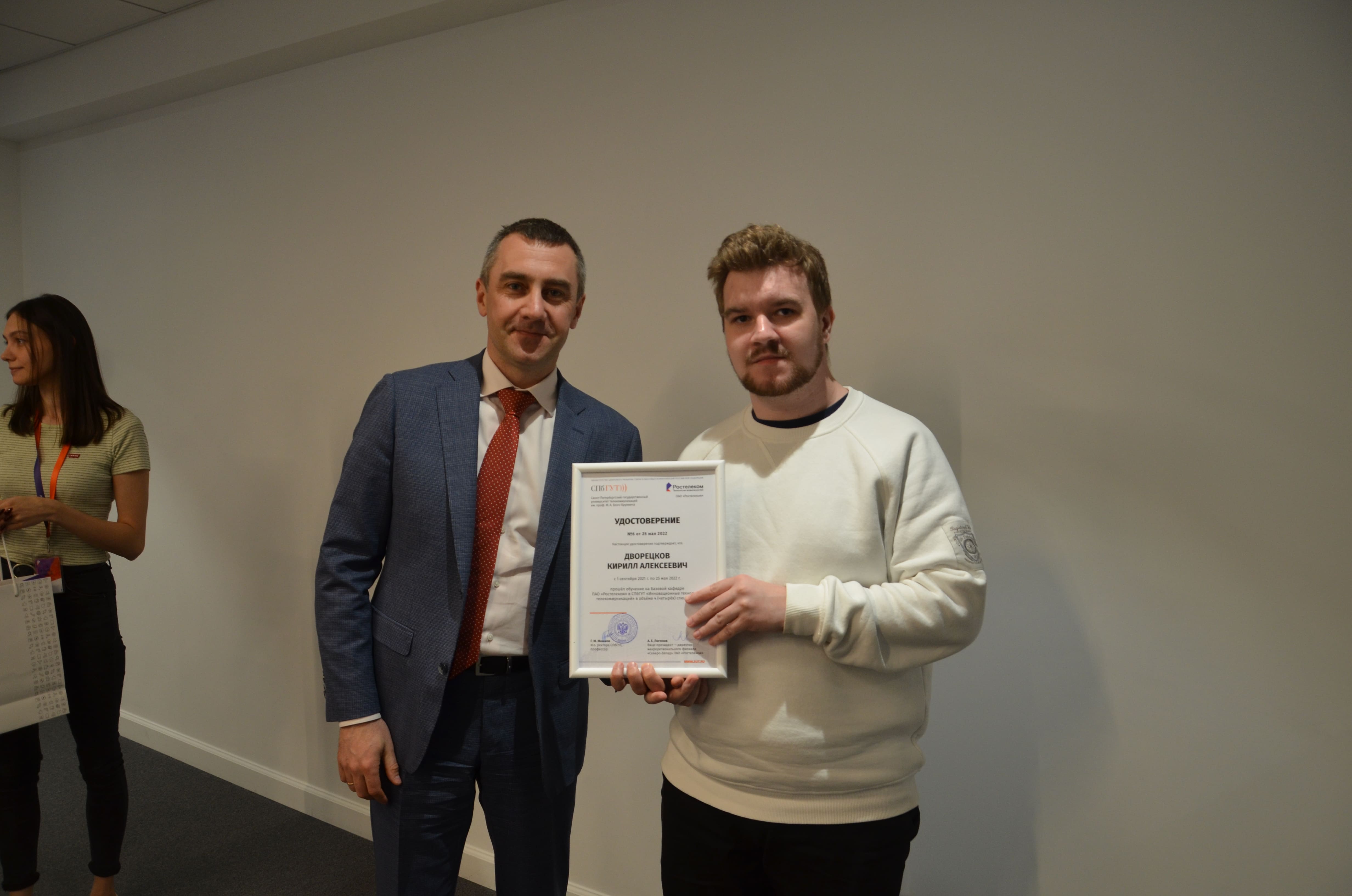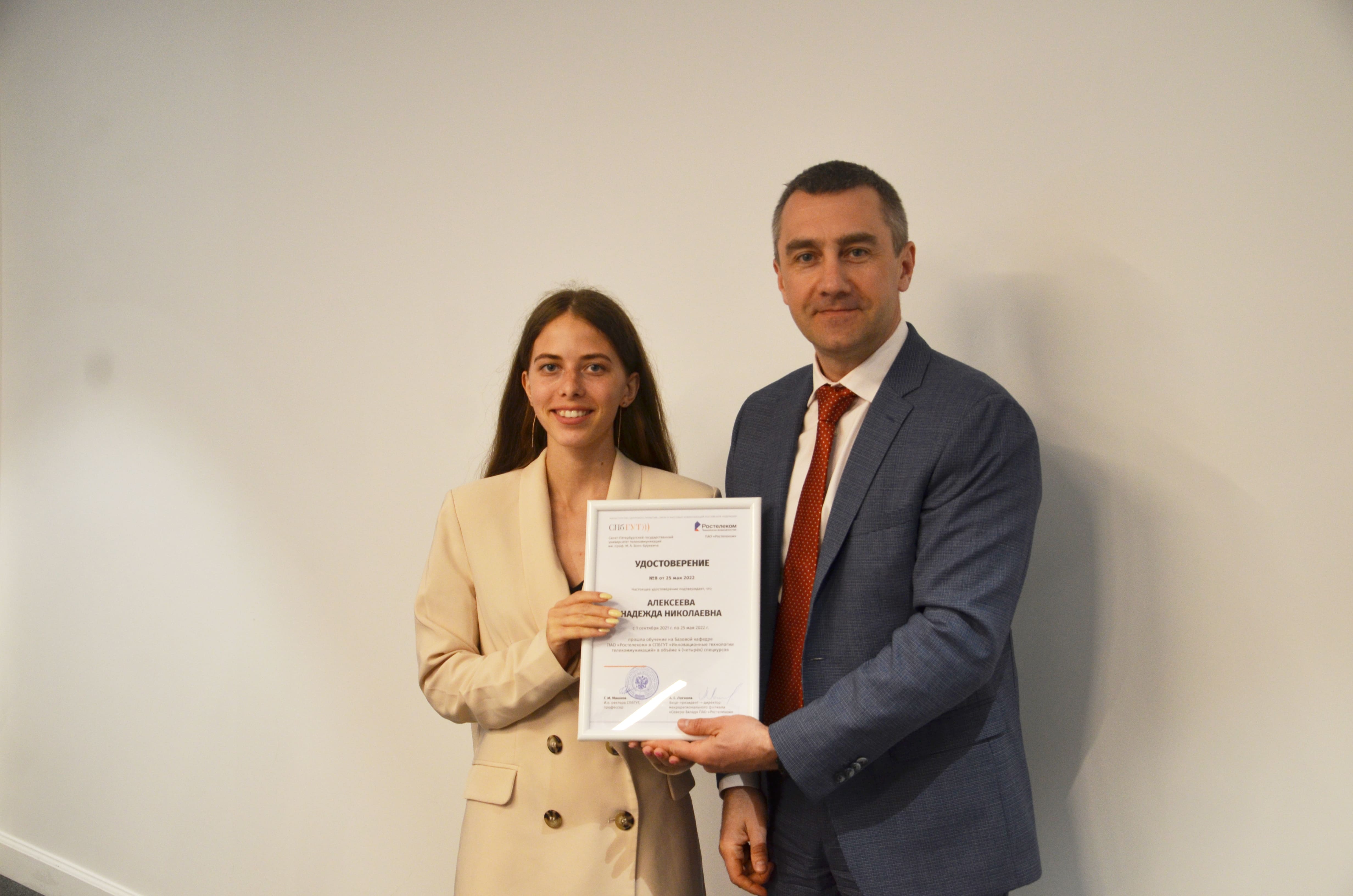 8 июня в Макрорегиональном филиале «Северо-Запад» ПАО «Ростелеком» состоялось торжественное вручение сертификатов выпускникам базовой кафедры «Инновационные технологии телекоммуникаций». Всего в СПбГУТ на кафедре обучалось более 40 слушателей, из которых 12 лучших прошли дополнительное анкетирование и конкурсный отбор по итогам обучения.