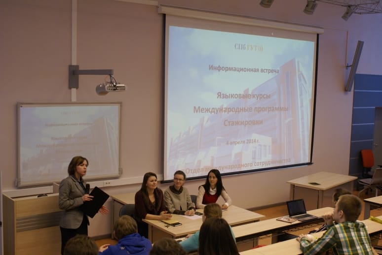 4 апреля в рамках «Дней иностранных языков» в СПбГУТ состоялась информационная встреча начальника отдела международного сотрудничества Н.Н. Журавлевой со студентами и преподавателями. Во встрече также приняли участие специалисты отдела Ж.А. Баркарь и А.В. Соловьева. Мероприятие было организовано кафедрой иностранных и русского языков СПбГУТ.
