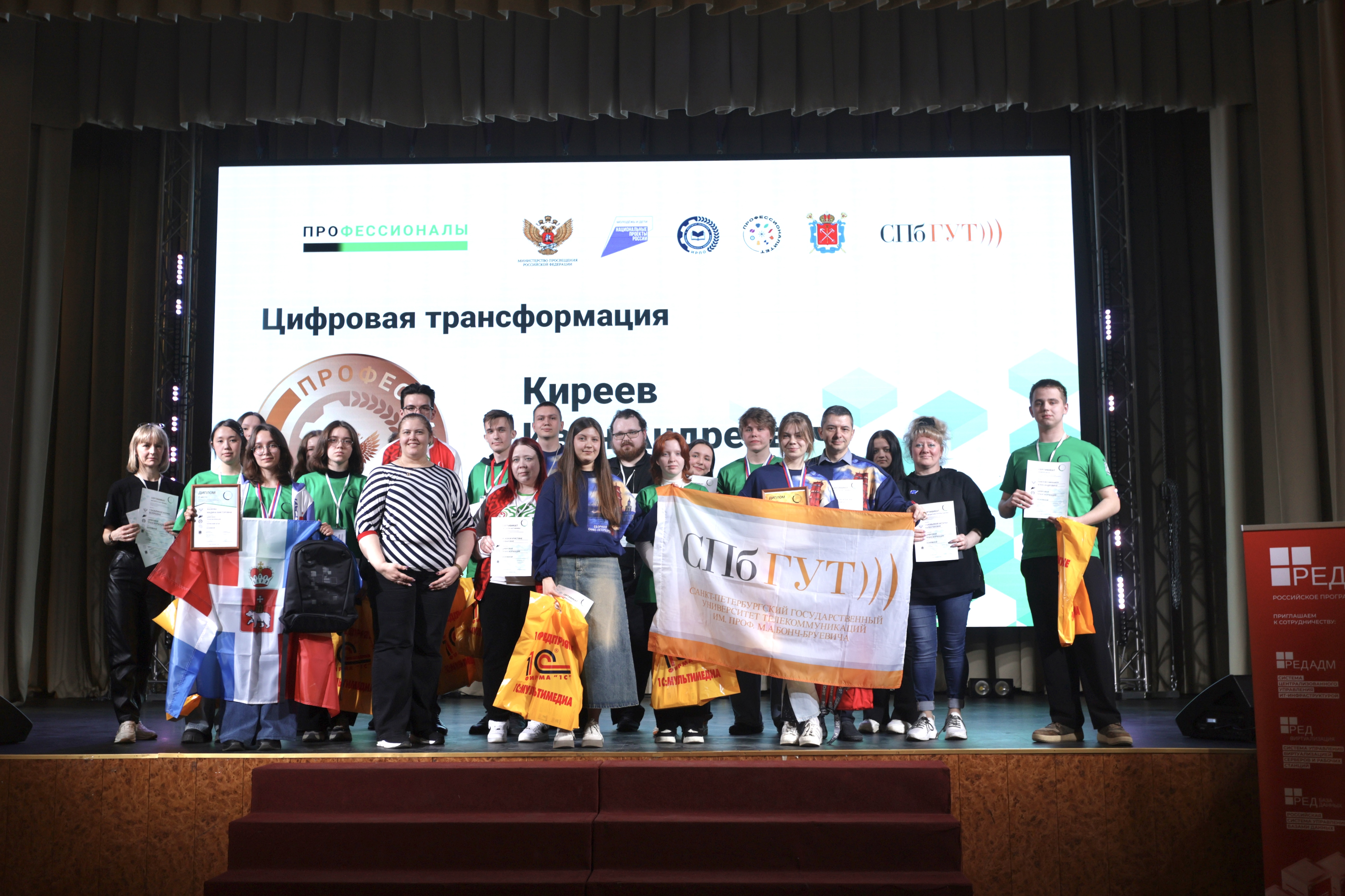 В Санкт-Петербурге на площадке СПбГУТ прошла торжественная церемония награждения победителей итогового (межрегионального) этапа Всероссийского чемпионатного движения «Профессионалы». В соревнованиях по четырем ИТ-компетенциям встретились победители региональных этапов из десятков субъектов РФ – от Санкт-Петербурга до Сахалина, от Краснодара до Архангельска.