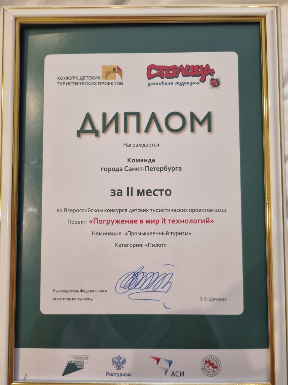 По итогам конкурса в номинации «Промышленный туризм» второе место занял проект «Погружение в мир IT», представленный командой Санкт-Петербурга в составе авторов и разработчиков проекта Ирины Веберовой, начальника центра довузовского образования СПбГУТ, и Ольги Патока, генерального директора ООО «Туристическая фирма «АВАНТУР».