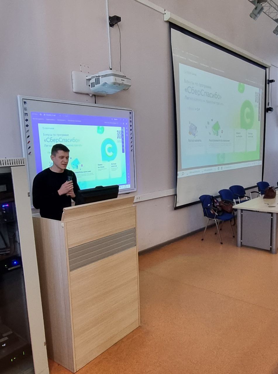 Студенты узнали о программе лояльности «СберСпасибо»: преимуществах кешбека, грамотном накоплении и выгодном использовании бонусов, а также о безопасности в цифровой среде. Речь шла о современных схемах мошенничества: телефонных звонках, поддельных SMS, фальшивых сайтах и др.