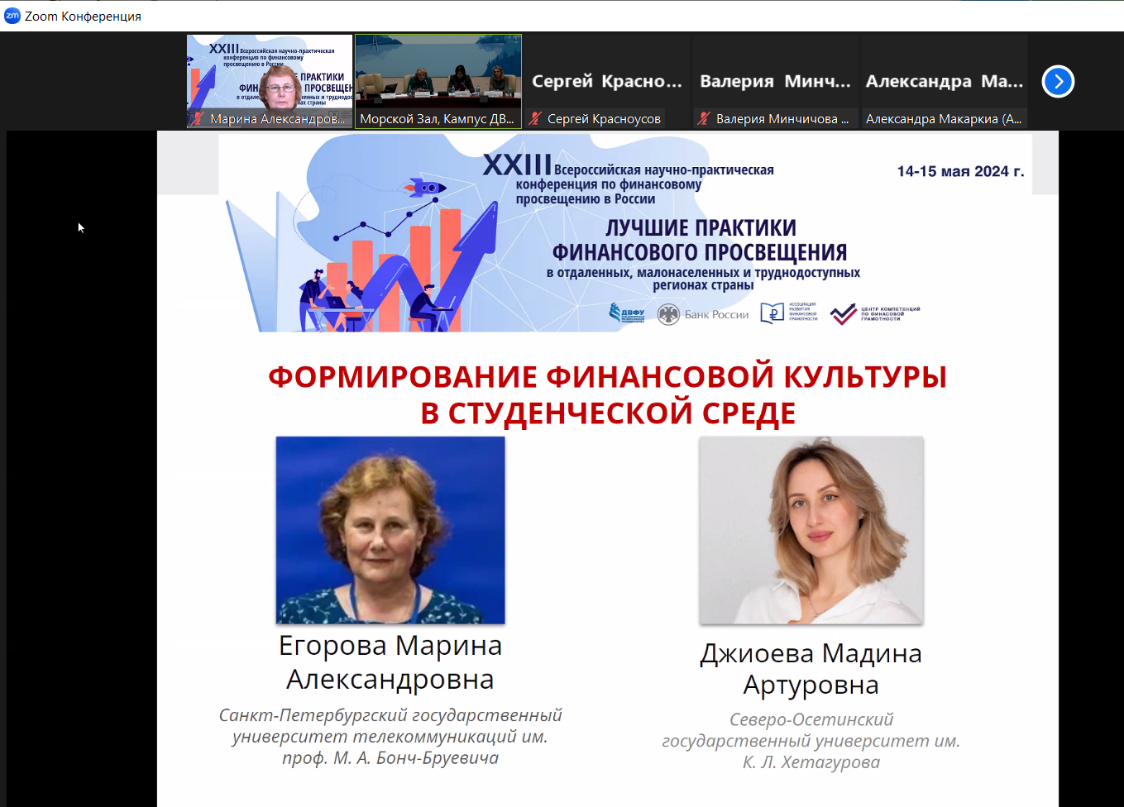 Доцент кафедры управления и моделирования в социально-экономических системах факультета ЦЭУБИ Марина Егорова присоединилась к работе XXIII Всероссийской научно-практической конференции по финансовому просвещению. Вместе с коллегой из Северо-Осетинского государственного университета Мадиной Джиоевой она выступила с докладом о финансовой культуре в студенческой среде.