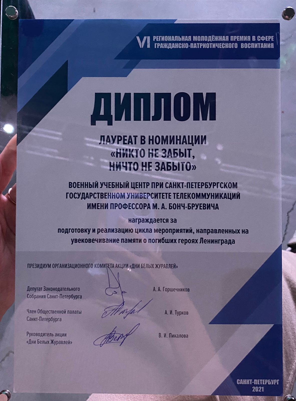 Военный учебный центр при Санкт-Петербургском государственном университете телекоммуникаций им. проф. М. А. Бонч-Бруевича стал лауреатом премии в номинации «Никто не забыт и ничто не забыто».