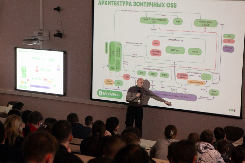 Опытом совмещения учебы и работы в ПАО «МегаФон» поделился ведущий инженер по техподдержке фиксированных услуг Геник Мурадян. Он рассказал студентам и о выстраивании личной карьерной траектории в компании.