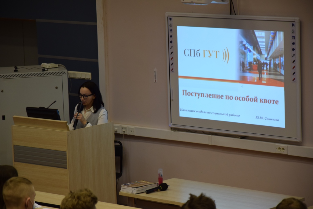 Начальник отдела по социальной работе Юлия Соколова рассказала о возможности поступления в СПбГУТ по особой квоте. Такая квота устанавливается ежегодно и составляет не менее 10% от общего количества бюджетных мест на бакалавриате и специалитете. Поступать по квоте могут дети-инвалиды, инвалиды 1 и 2 групп, инвалиды с детства, дети-сироты и другие категории граждан. Абитуриент должен подтвердить свое право на льготное зачисление, представить соответствующие документы.