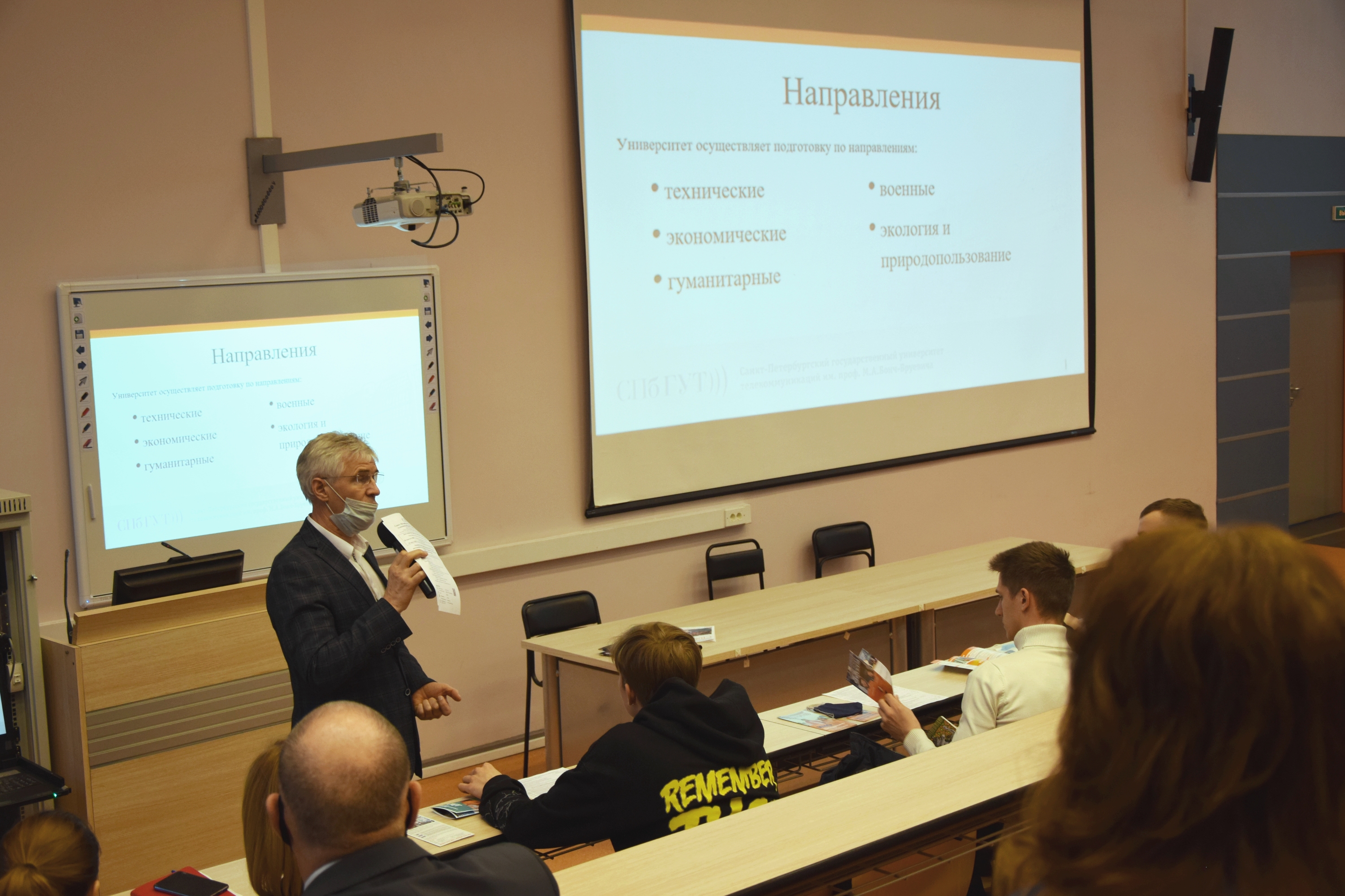 Ответственный секретарь приемной комиссии, заведующий кафедрой теоретических основ телекоммуникаций СПбГУТ Павел Шумаков представил абитуриентам все виды обучения: бакалавриат, где студенты учатся 4 года, специалитет (5–5,5 лет), магистратура (2 года в случае очной формы обучения). Поступающие в «Бонч» могут выбрать любое из 17 направлений бакалавриата, 2 направлений специалитета, 11 направлений магистратуры. Правила приема и информация о направлениях размещены на сайте приемной комиссии СПбГУТ priem.sut.ru.
